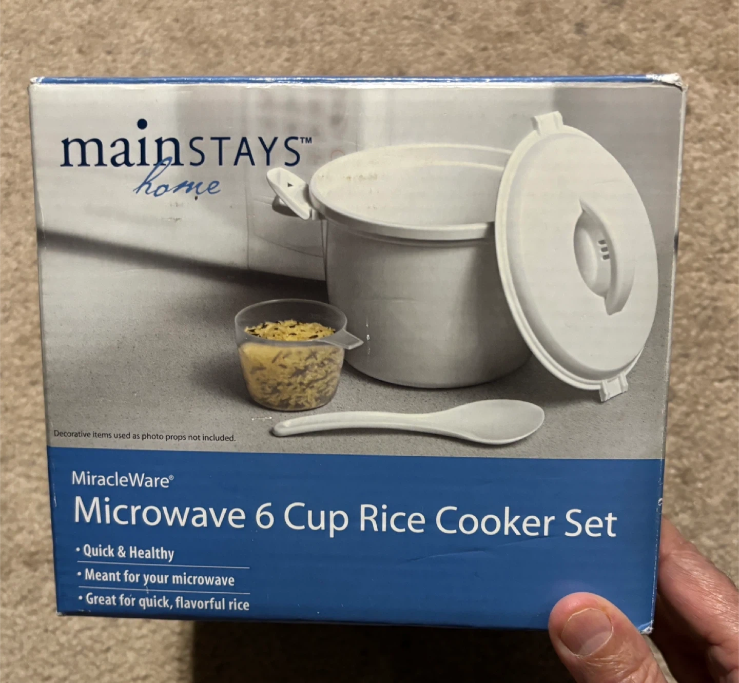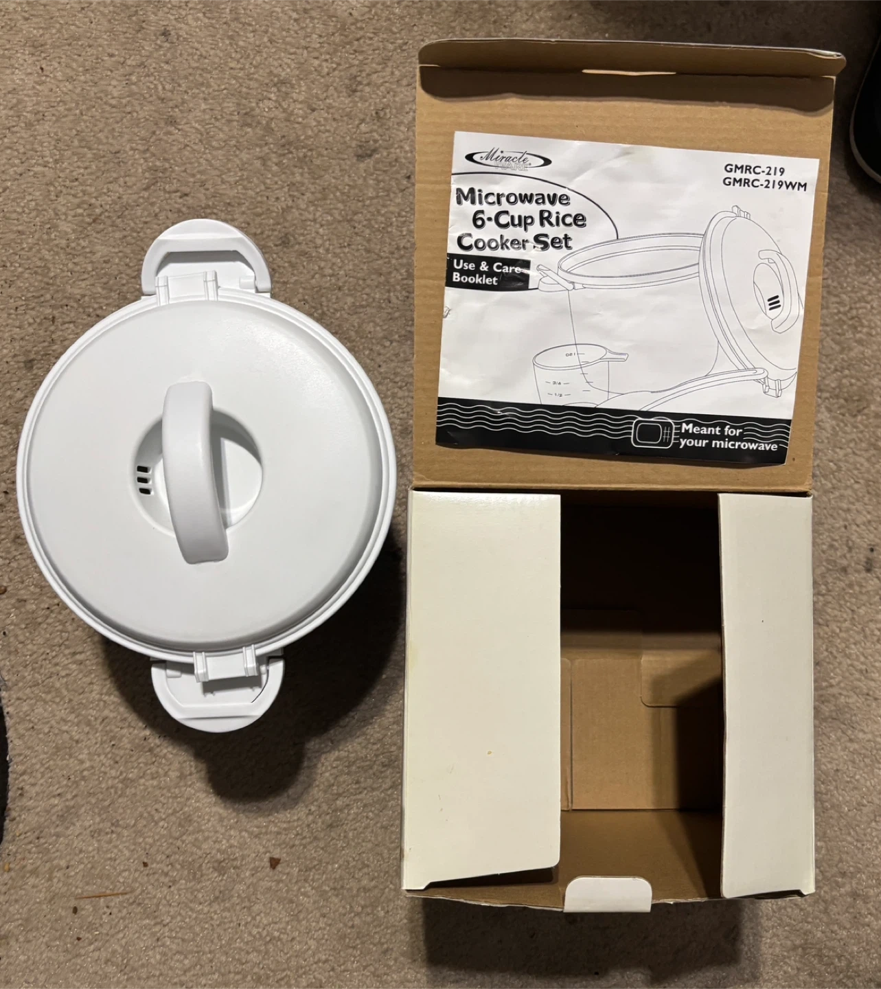 This is a MiracleWare 6 Cup Microwave Rice Cooker Set. It includes the cooker, a lid, a rice spoon, and a measuring cup. It's meant for your microwave and makes cooking rice quick and healthy! Brand new in box with instructions booklet.