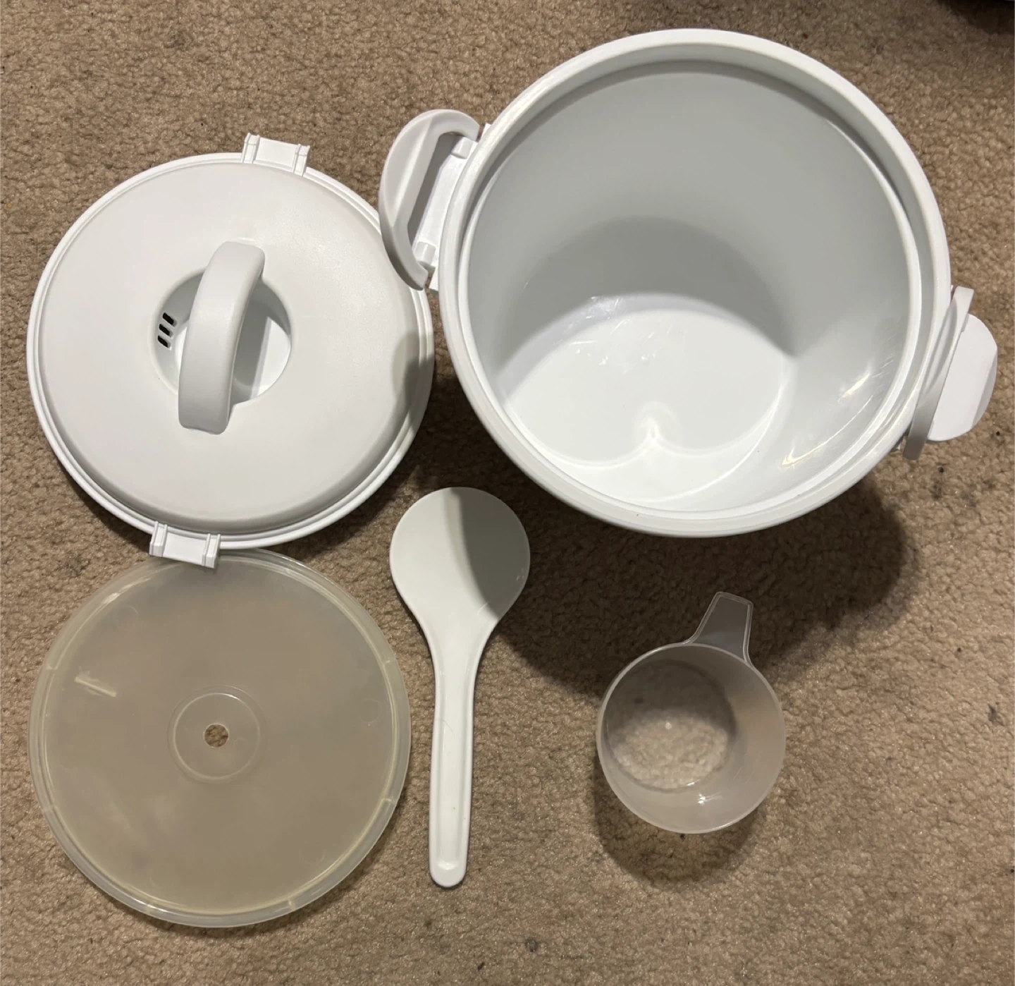 This is a MiracleWare 6 Cup Microwave Rice Cooker Set. It includes the cooker, a lid, a rice spoon, and a measuring cup. It's meant for your microwave and makes cooking rice quick and healthy! Brand new in box with instructions booklet.