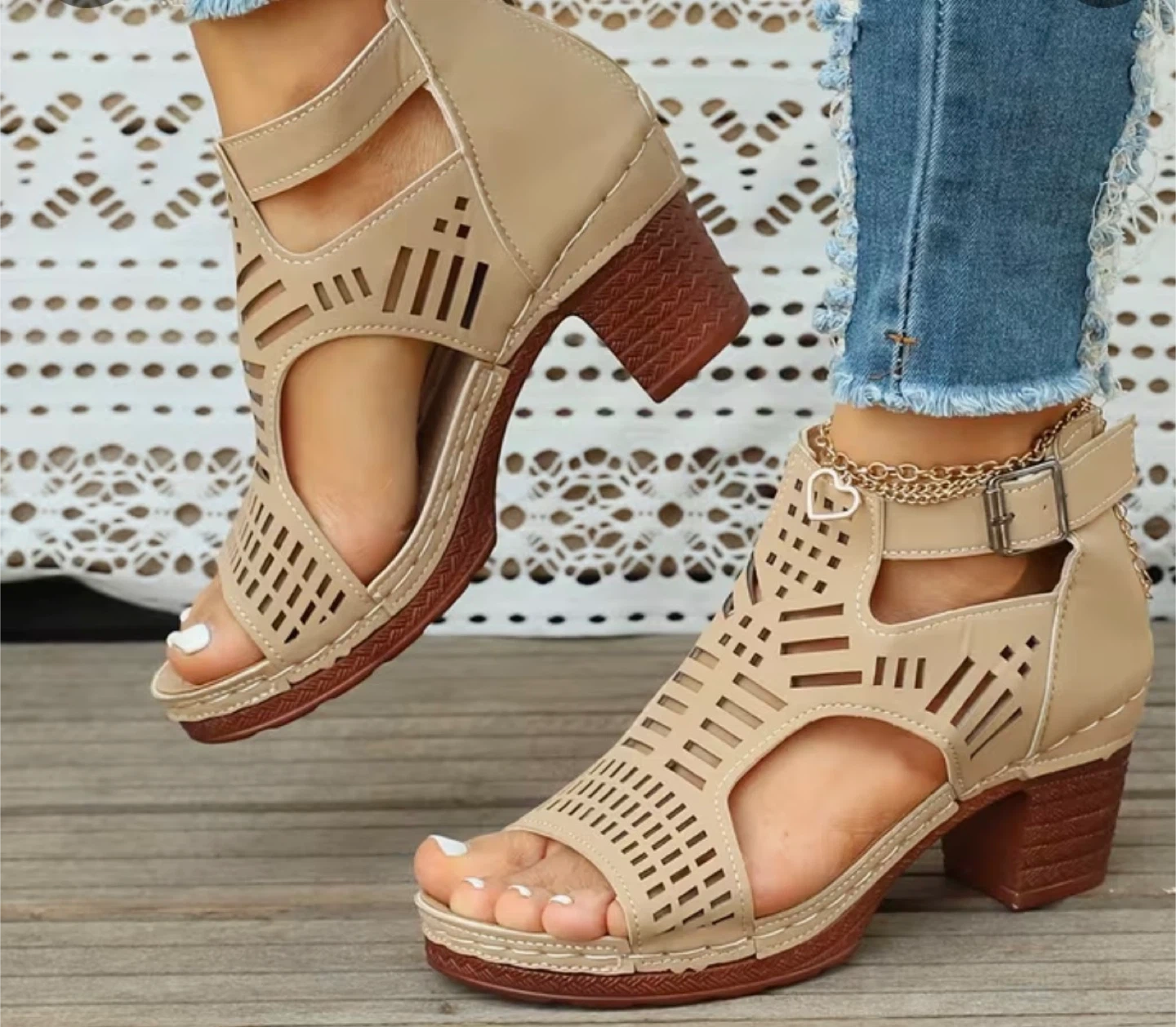 Beige heeled sandals featuring a cutout design and decorative ankle chain. They have a side zipper for easy wear and a block heel. Perfect for adding a stylish touch to your outfit!
