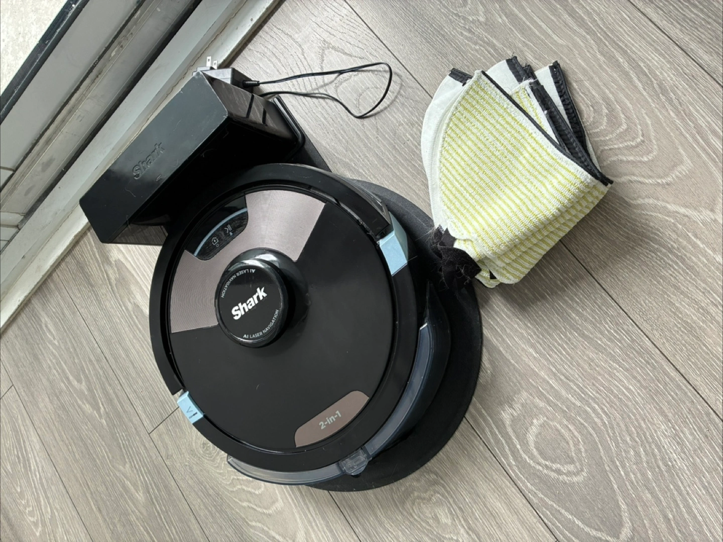 Wifi and app compatible Shark robot vacuum and mop. Model RV2610WDC. Includes charging dock and additional cleaning cloths. Pick up in Liberty Village, delivery available for additional fee. Used but in good condition