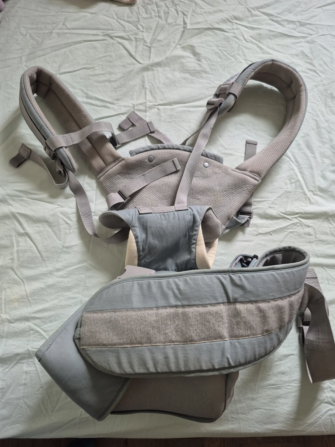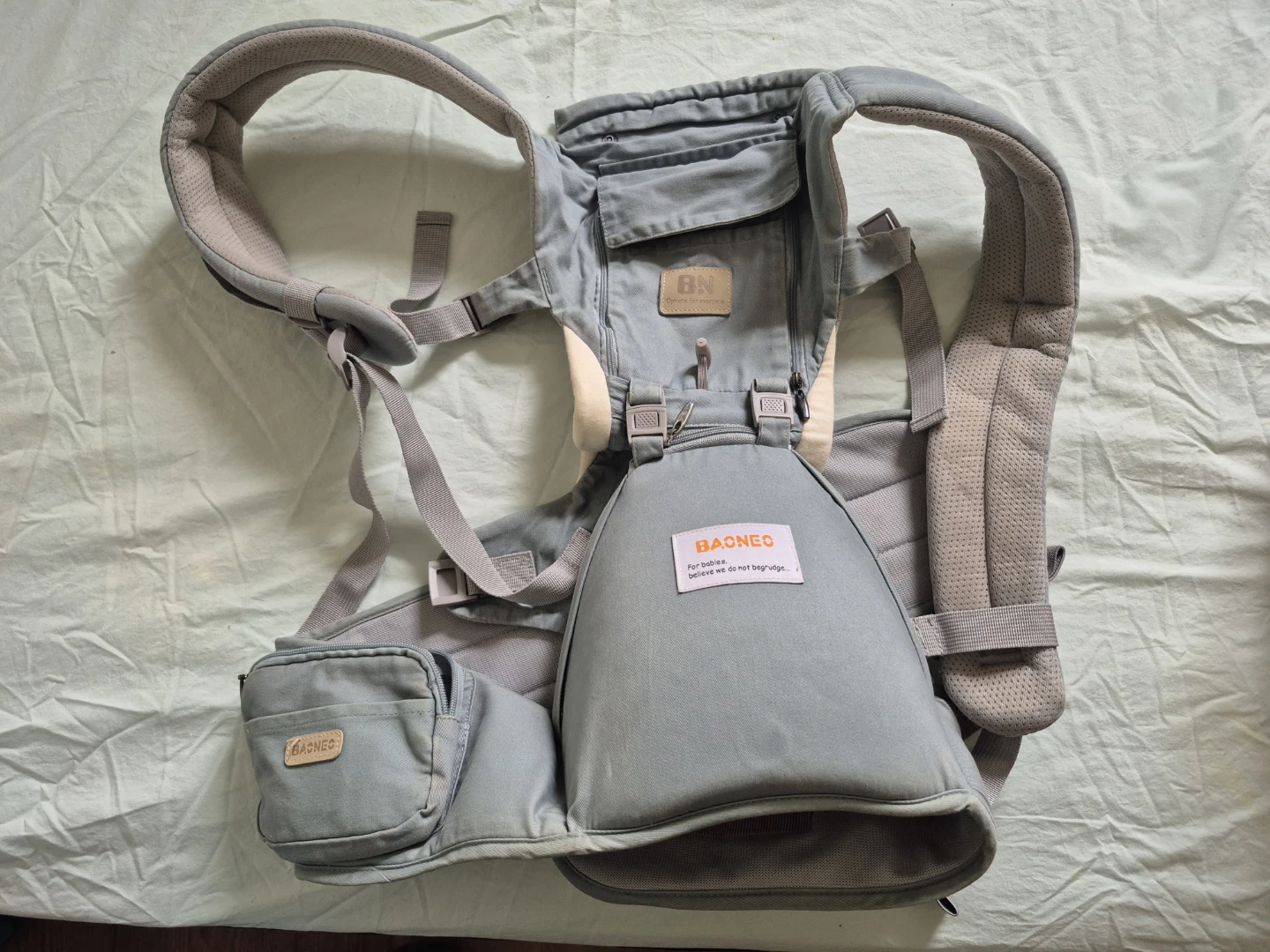Baoneo baby carrier in a light blueish grey colour. This carrier has padded shoulder straps for comfort. It's suitable for carrying babies and toddlers.
