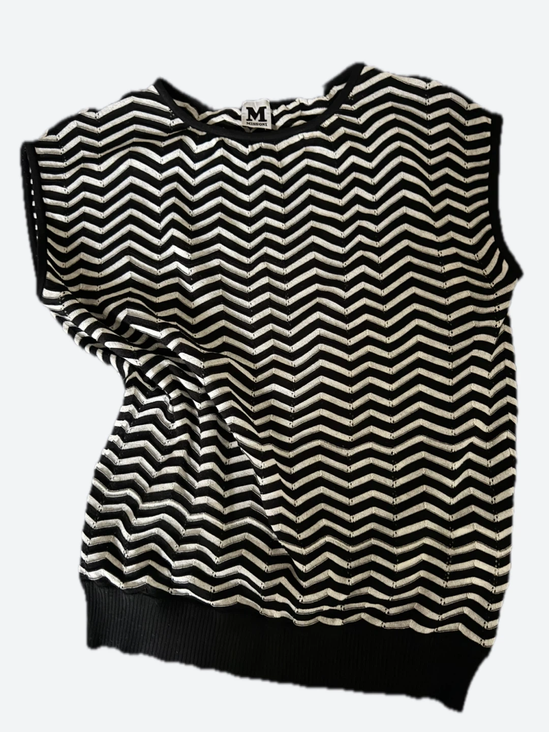 This sleeveless Missoni knit top features a classic black and white chevron zig-zag pattern. It's made in Italy and is a European size 40. It's a stylish piece for any wardrobe!