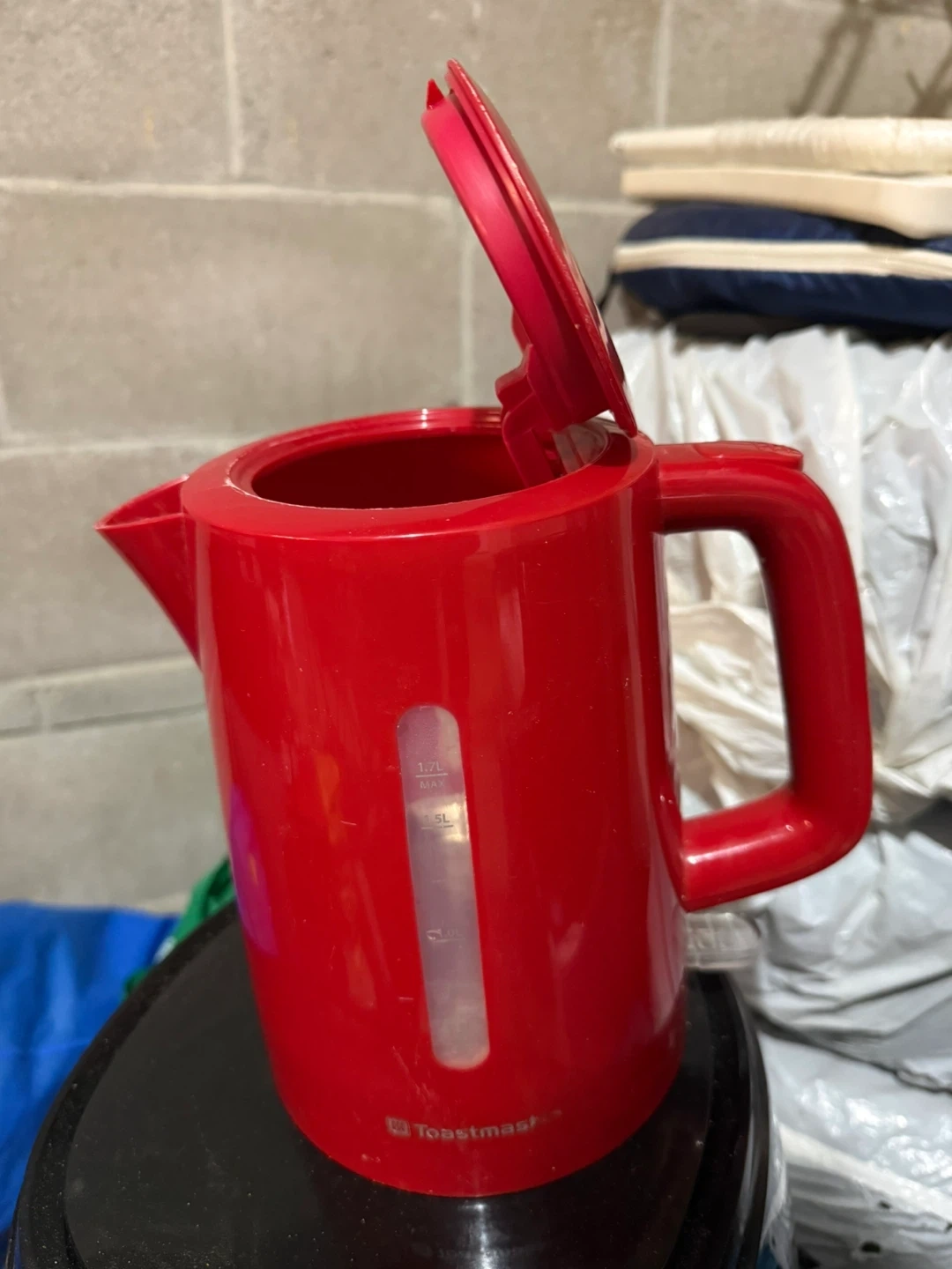 This is a red electric kettle from Toastmaster. It has a water level indicator. Maximum capacity is 1.7L.