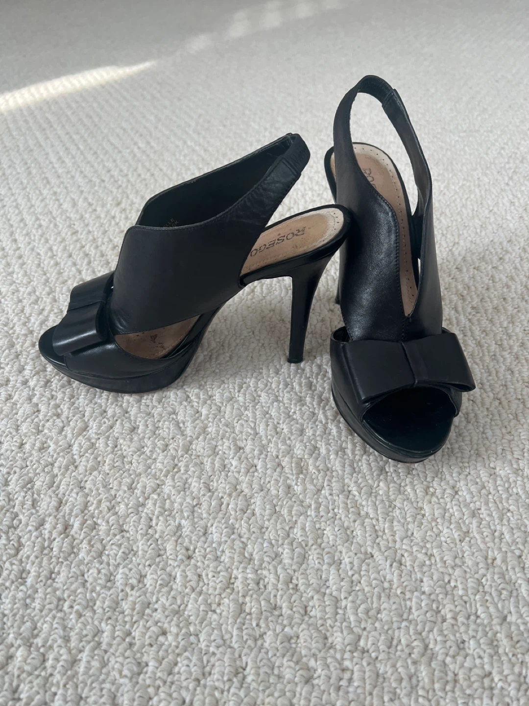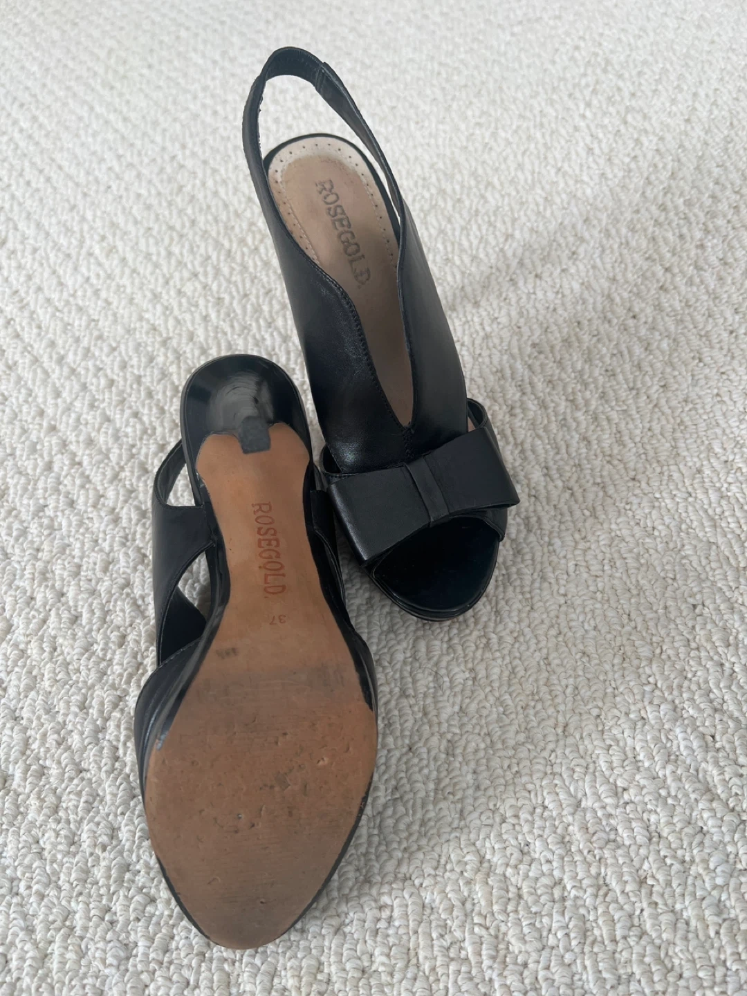 Stylish Rosegold black leather slingback heels featuring a bow accent. They're a European size 37 with an open toe and a stiletto heel. Perfect for dressing up an outfit!