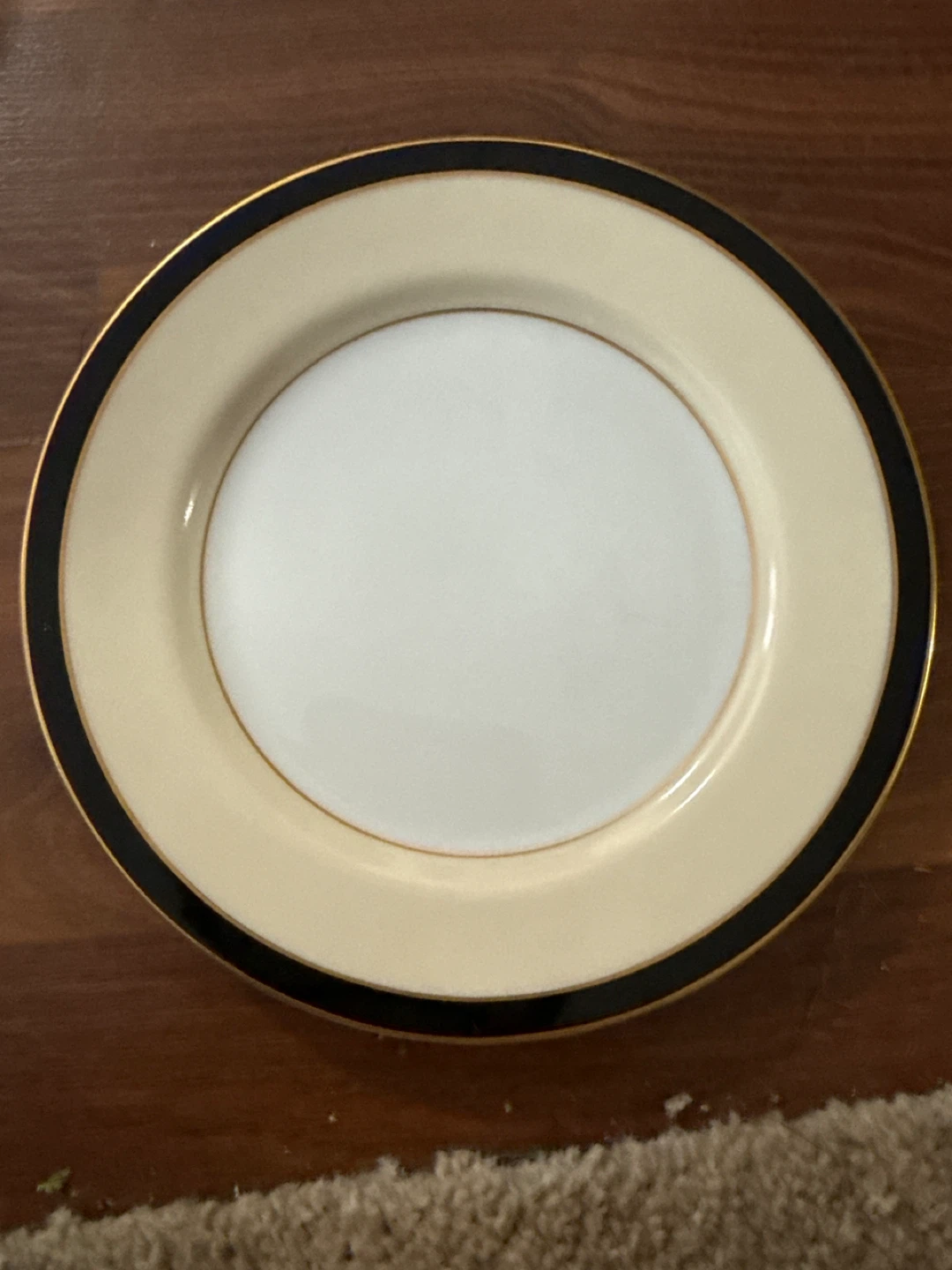 Selling a Mikasa Montauk plate by Fitz and Floyd. It has a cream colour with gold and black trim. A lovely addition to any table setting! Can also be used as a replacement piece to your collection.