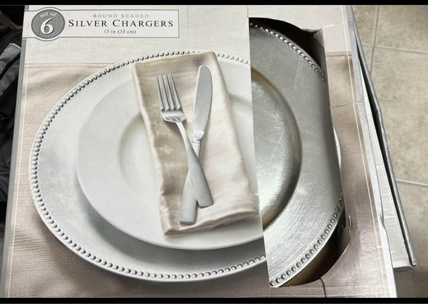 This set includes six round beaded charger plates. They are silver and measure 13 inches (33 cm) in diameter. These plates add a decorative touch to your table setting.