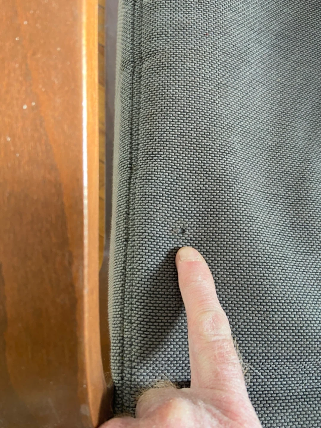 This is a grey IKEA Poäng chair with an ottoman. Stained wood frame and fabric upholstery. There's a small snag on the chair cushion. Great for relaxing!
