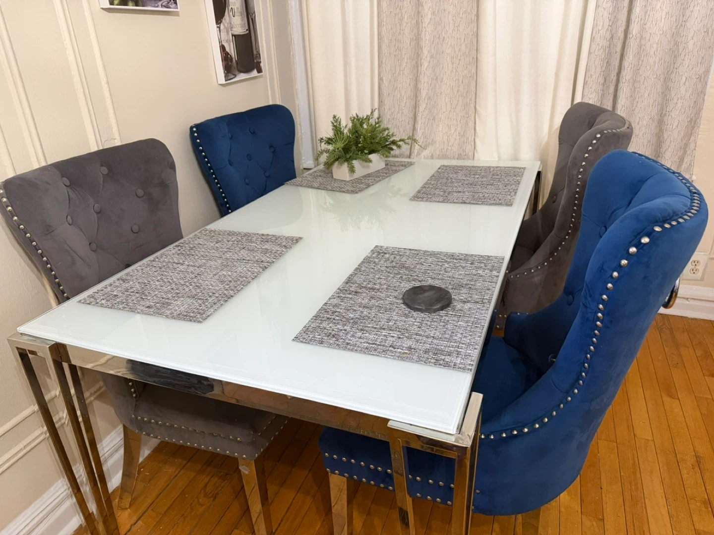 A sleek white glass top dining table with modern chrome legs. It's perfect for seating up to 6 people. The glass surface is easy to wipe clean.