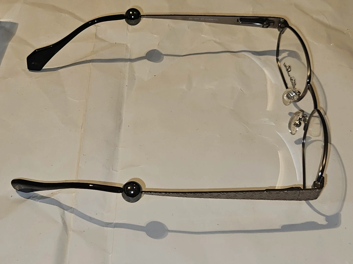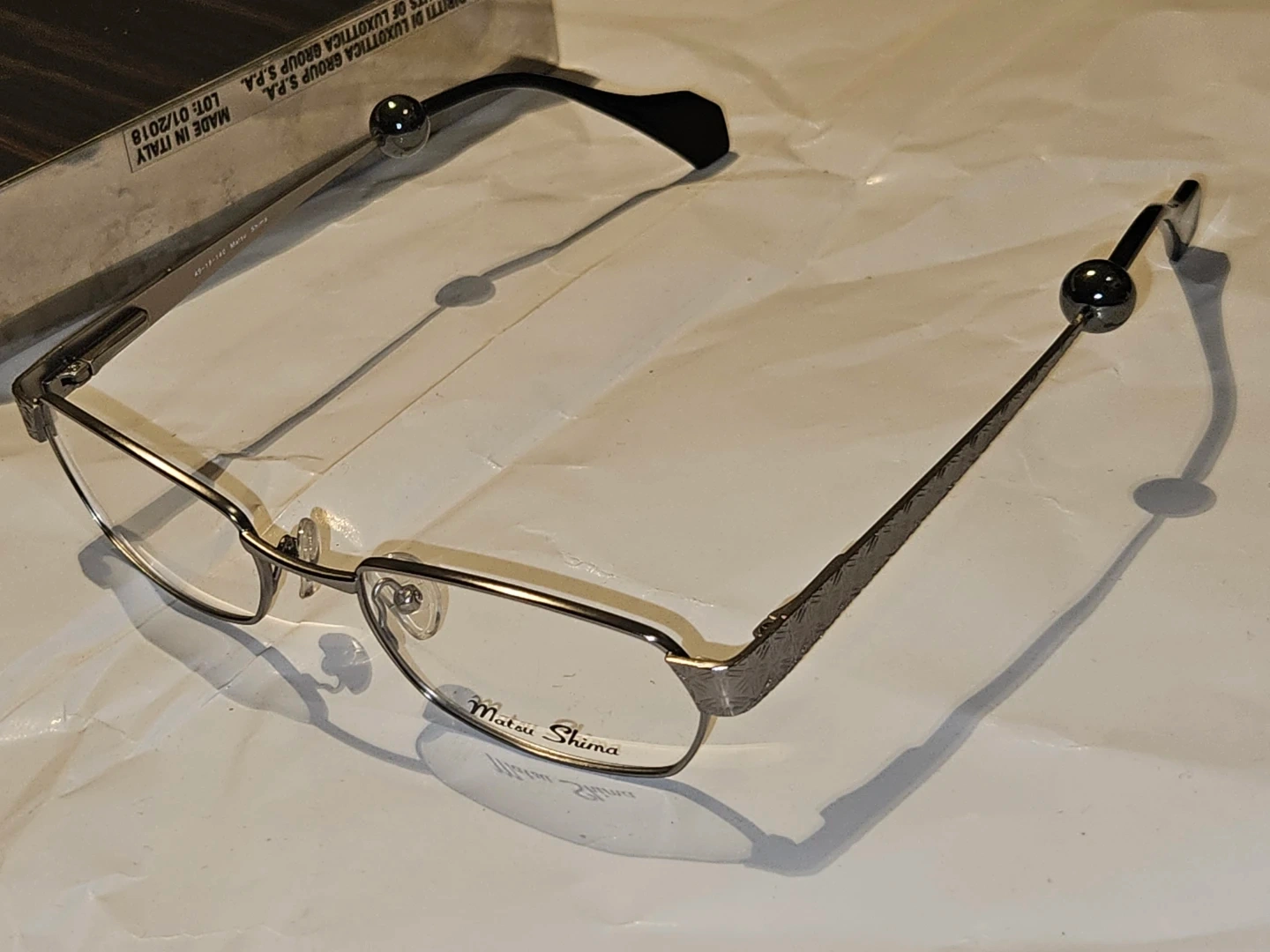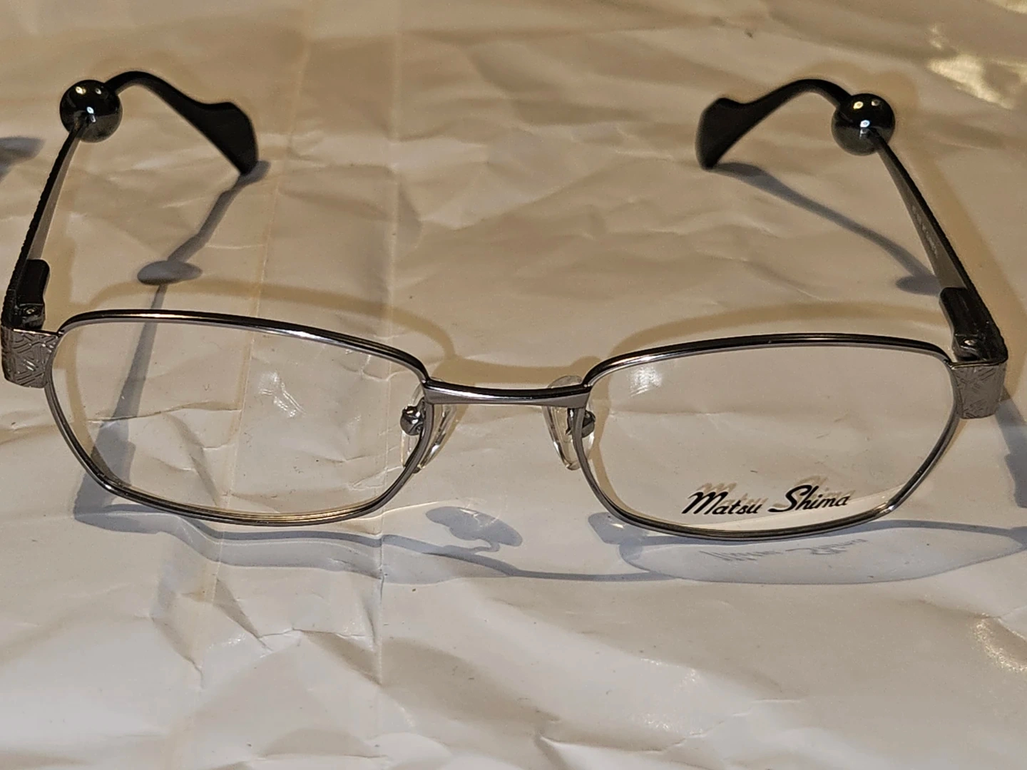 Matsu Shima eyeglasses in a gunmetal finish. Model MS 1826. These glasses offer a sleek and modern design. They're made with durable metal and plastic temple tips components.