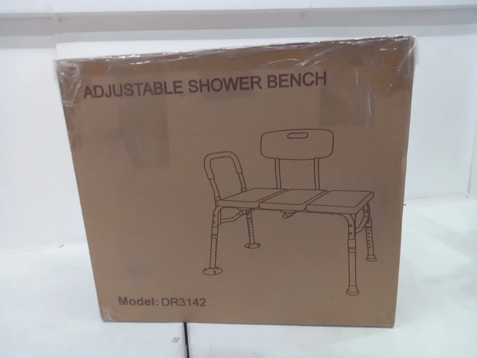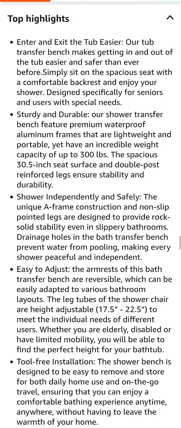 This Careboda tub transfer bench and shower chair is designed with a backrest and soft arm support, providing safety and comfort for seniors or anyone needing assistance. The bench is adjustable to fit different tub heights and supports up to 300 lbs.