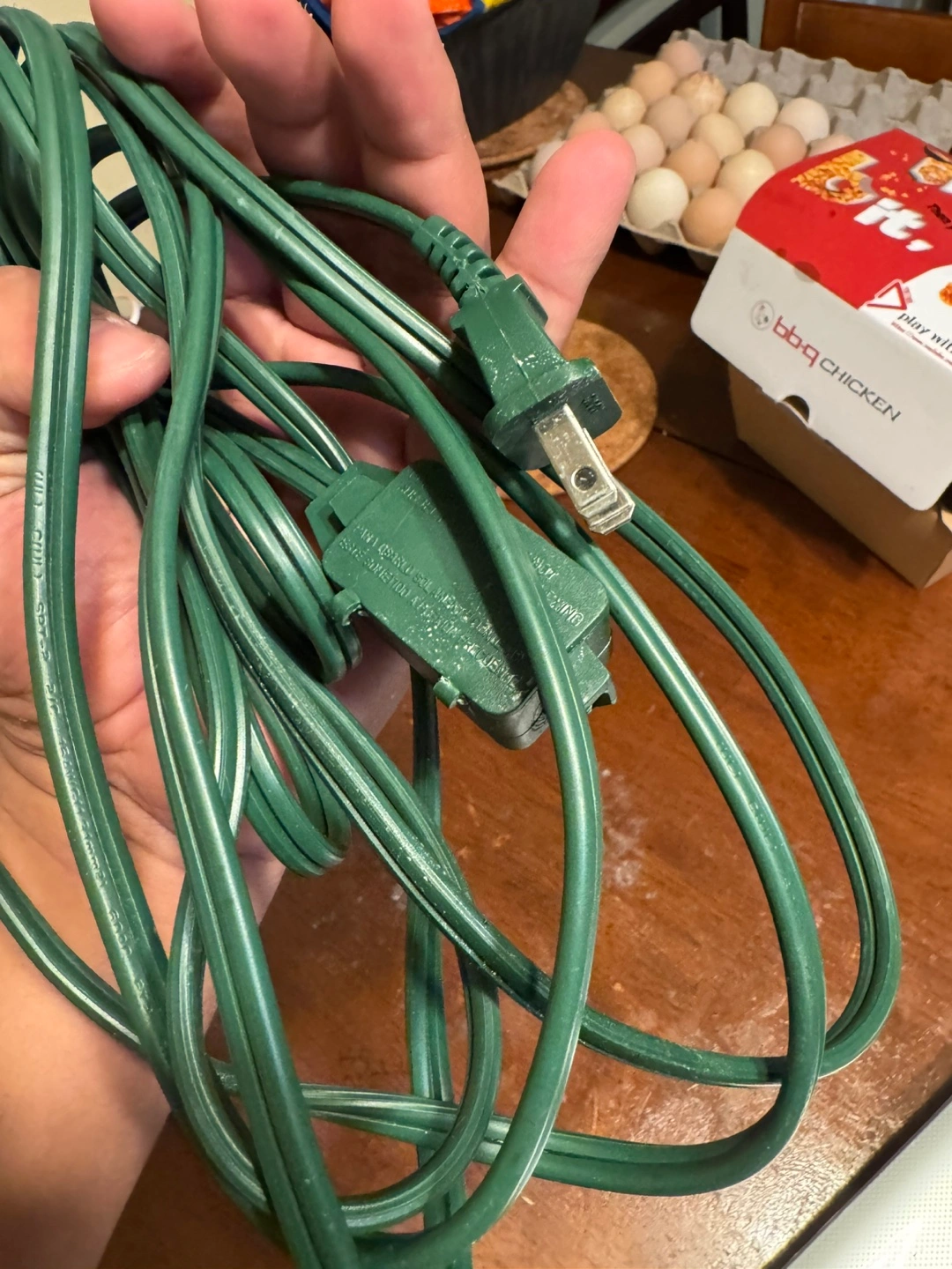 Selling a green extension cord. It's in used condition with some wear and tear on the plug, as you can see in the photos. Still functions as it should!