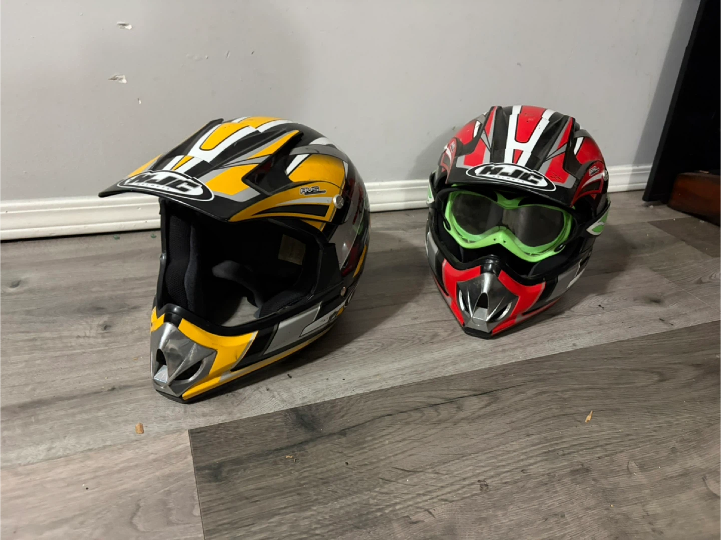 Two HJC dirt bike helmets with goggles included. One helmet is black, yellow, and silver. The other helmet is red, black, and silver. These helmets are great for off-road riding!