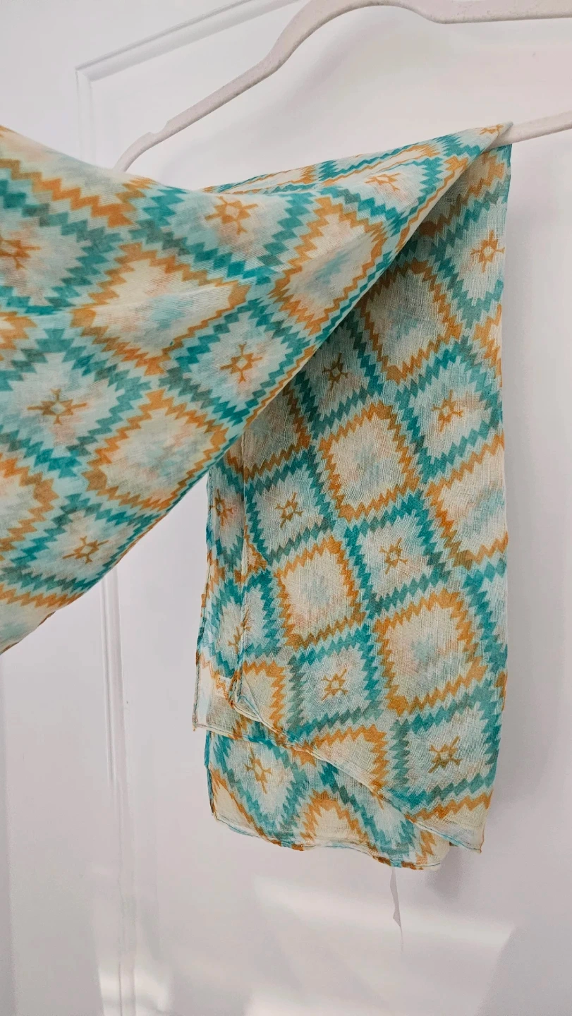 Brand new sheer scarf featuring a repeating diamond pattern in teal and orange. Lightweight and great for adding a pop of colour to an outfit!