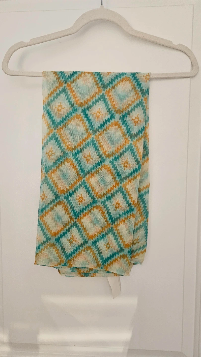 Brand new sheer scarf featuring a repeating diamond pattern in teal and orange. Lightweight and great for adding a pop of colour to an outfit!