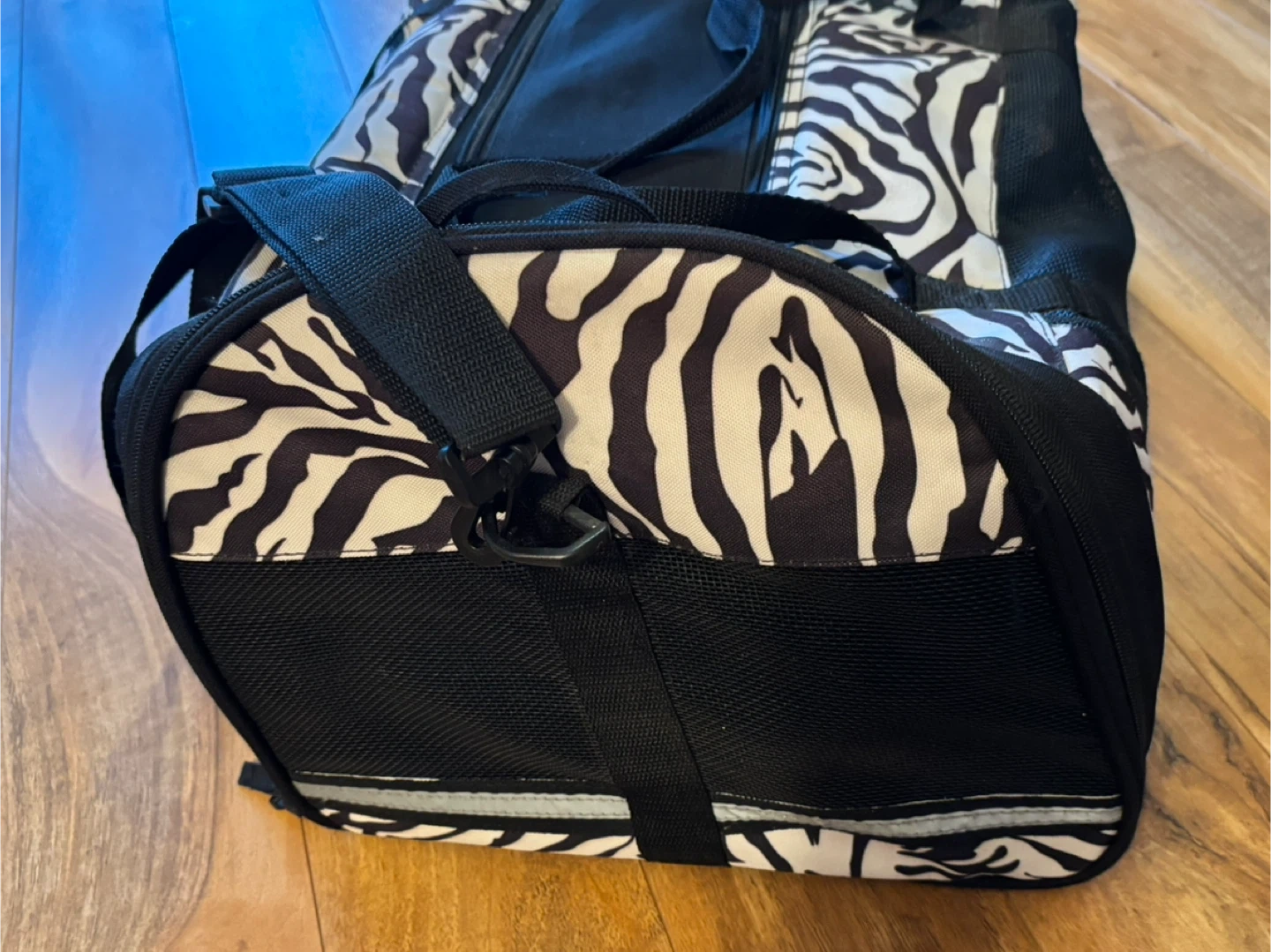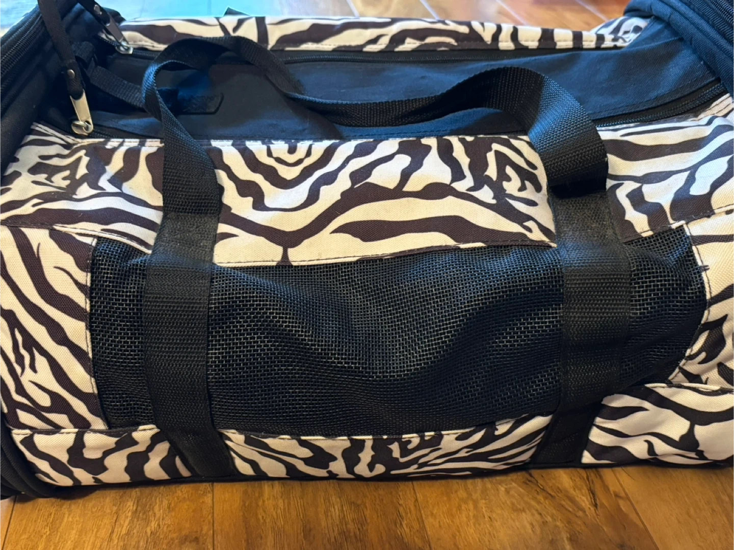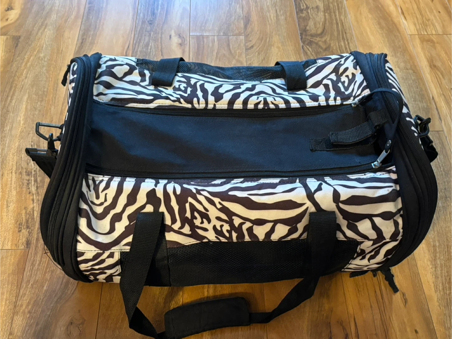 This zebra print pet carrier is great for small pets. It features mesh panels for ventilation and comfortable carrying handles. It's easy to clean and durable for travel.