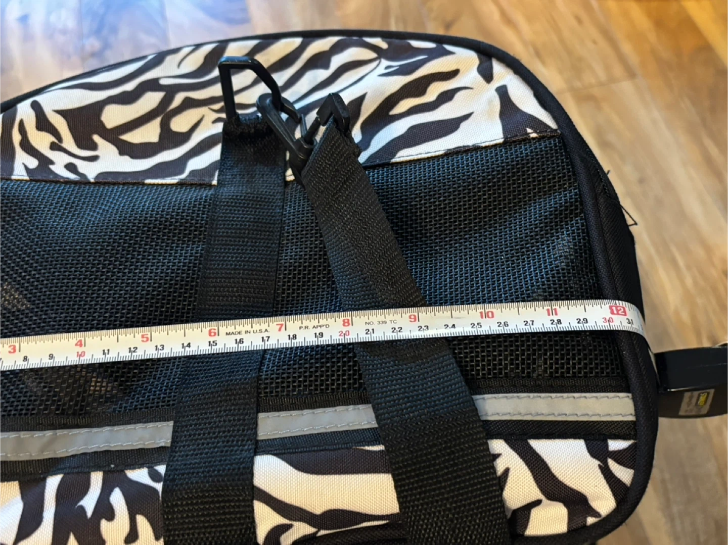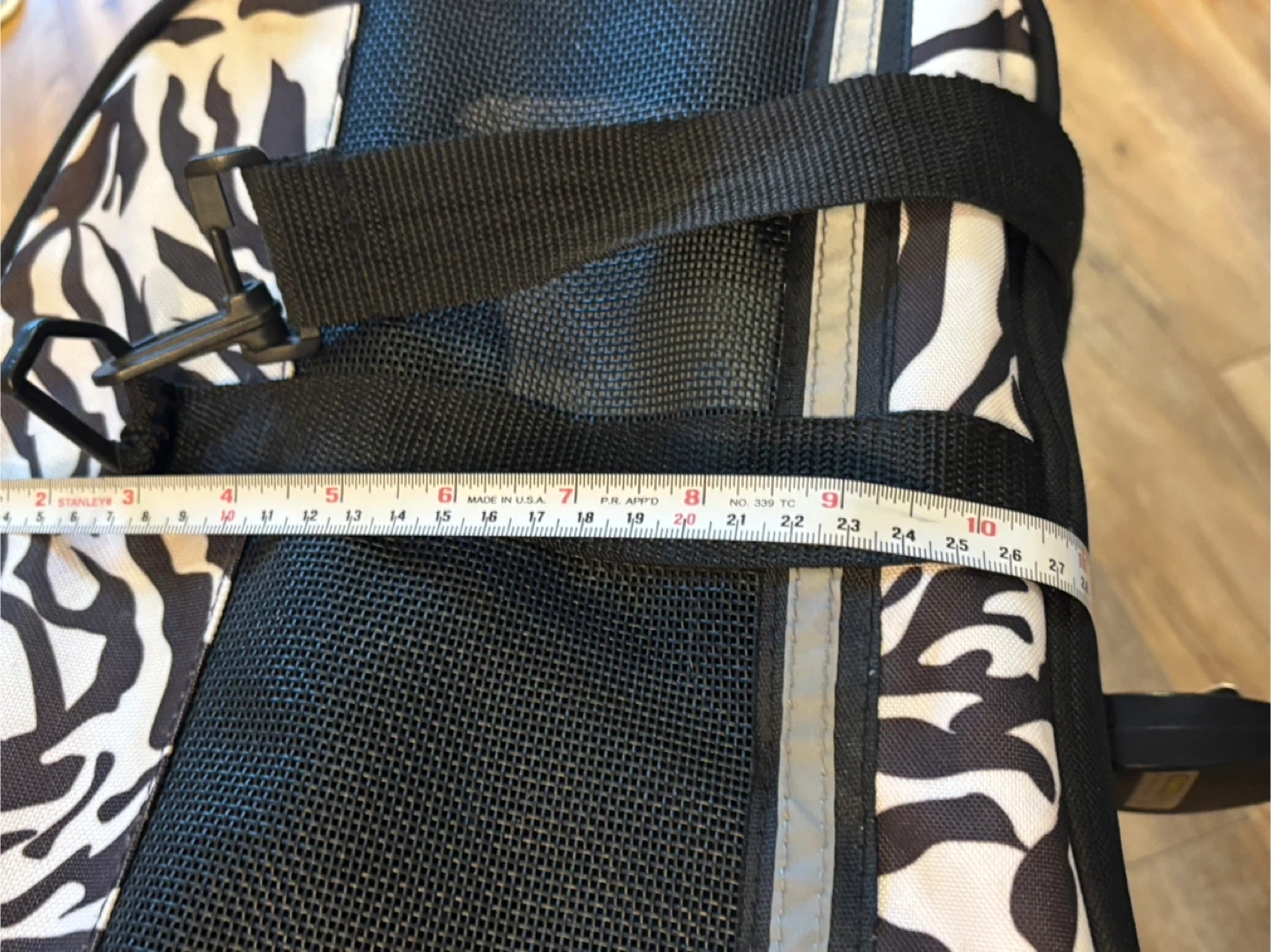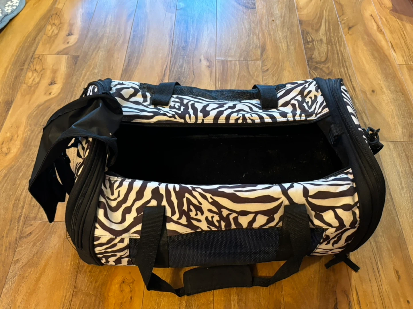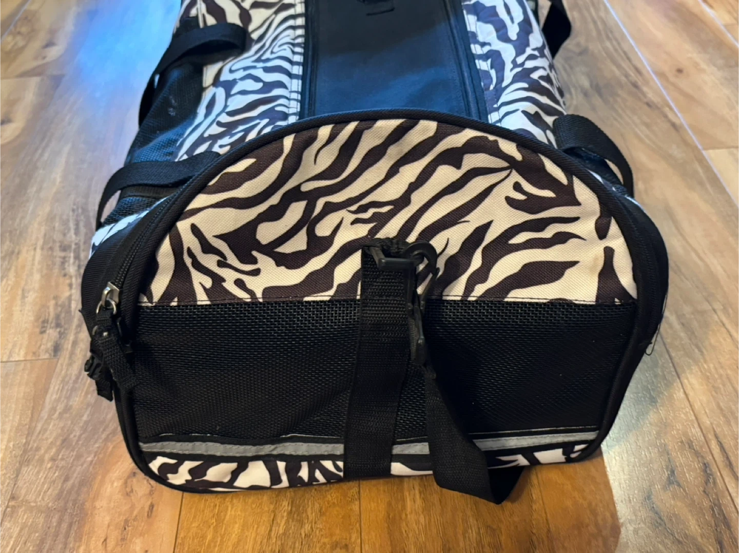 This zebra print pet carrier is great for small pets. It features mesh panels for ventilation and comfortable carrying handles. It's easy to clean and durable for travel.