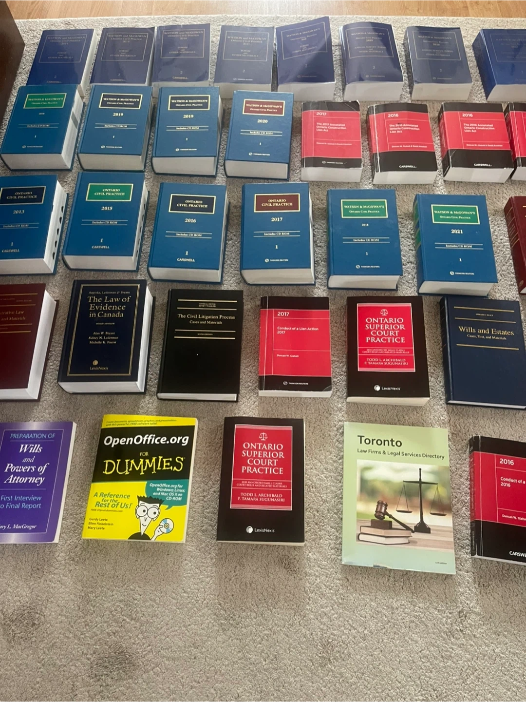 Collection of Canadian legal reference books, including statutes and practice guides. Most books are from 2015-2021. Includes titles on Wills & Estates, Civil Procedure, and practice manuals.