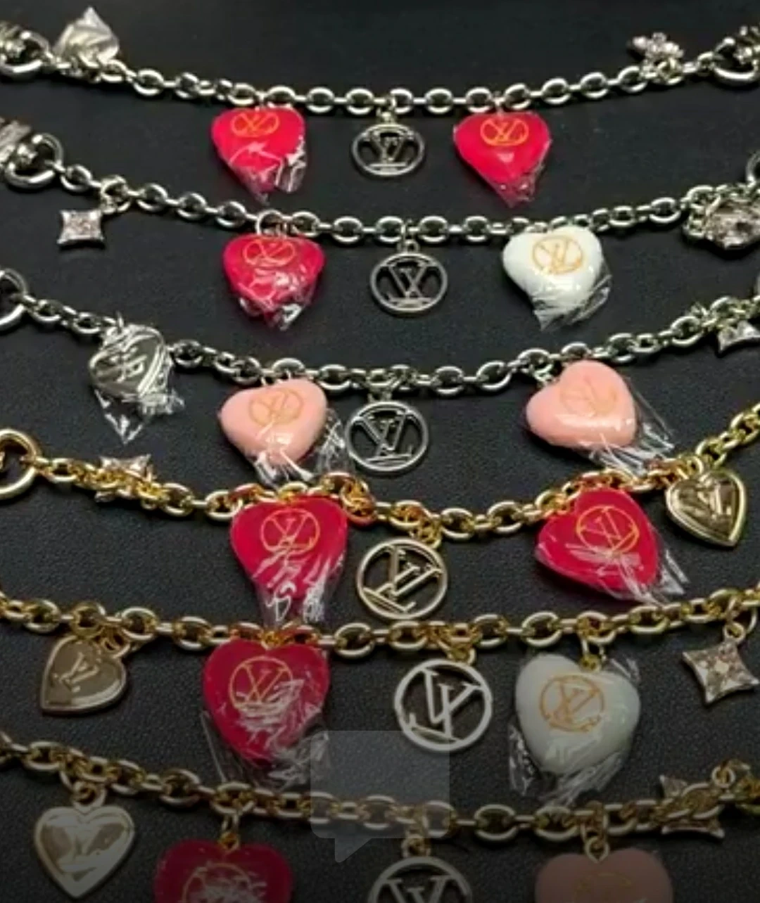 LV bag charms. They come with heart-shaped pendants in red, pink, and white. The chains are made of metal with both silver and gold-tone finishes.