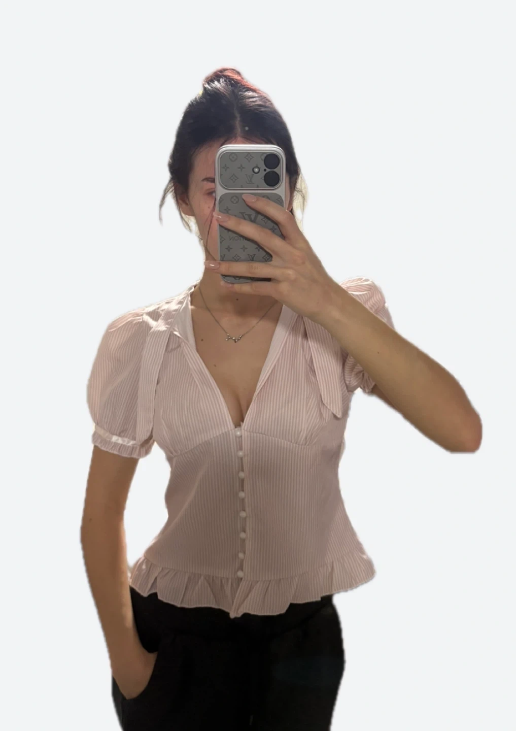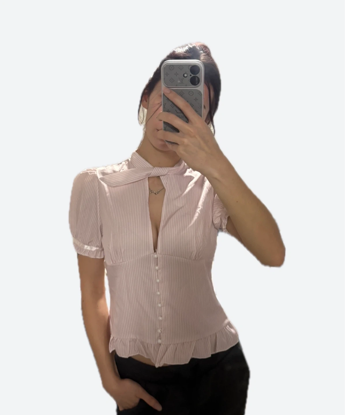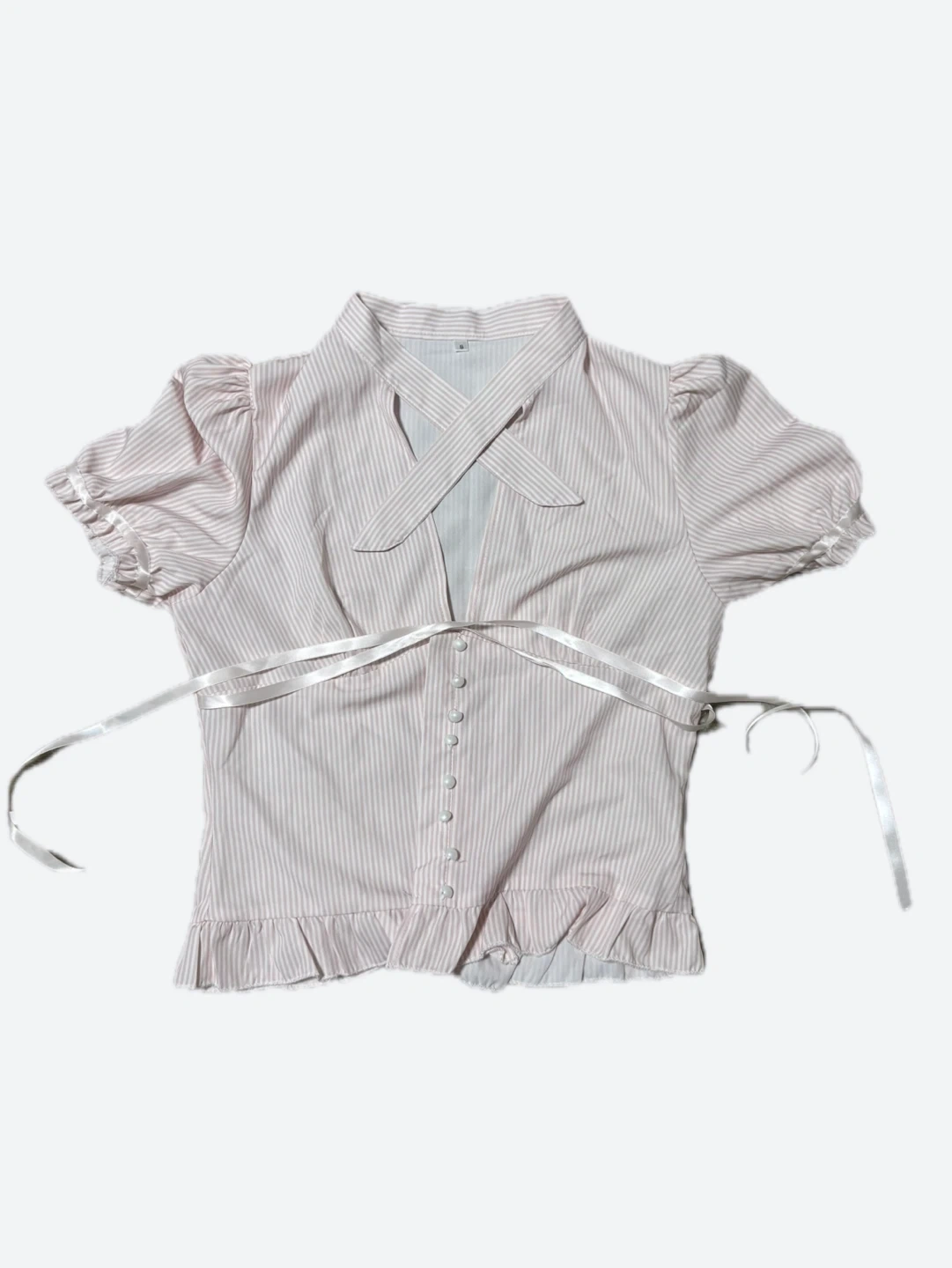 this blouse is sooo adorable. It has a tie-neck detail that you can wear or fold down, and button-up front. It has a ruffled hem and puff sleeves with a satin trim. Size S, only worn once!! 🩷🩷