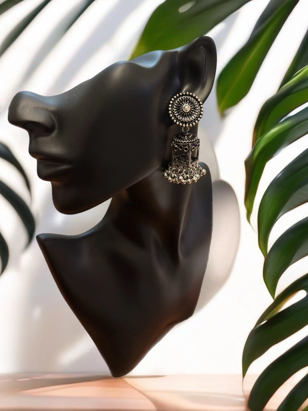 Beautiful oxidized silver jhumka earrings. Intricate detailing. Perfect for adding a touch of elegance to any outfit. Stunning statement piece.