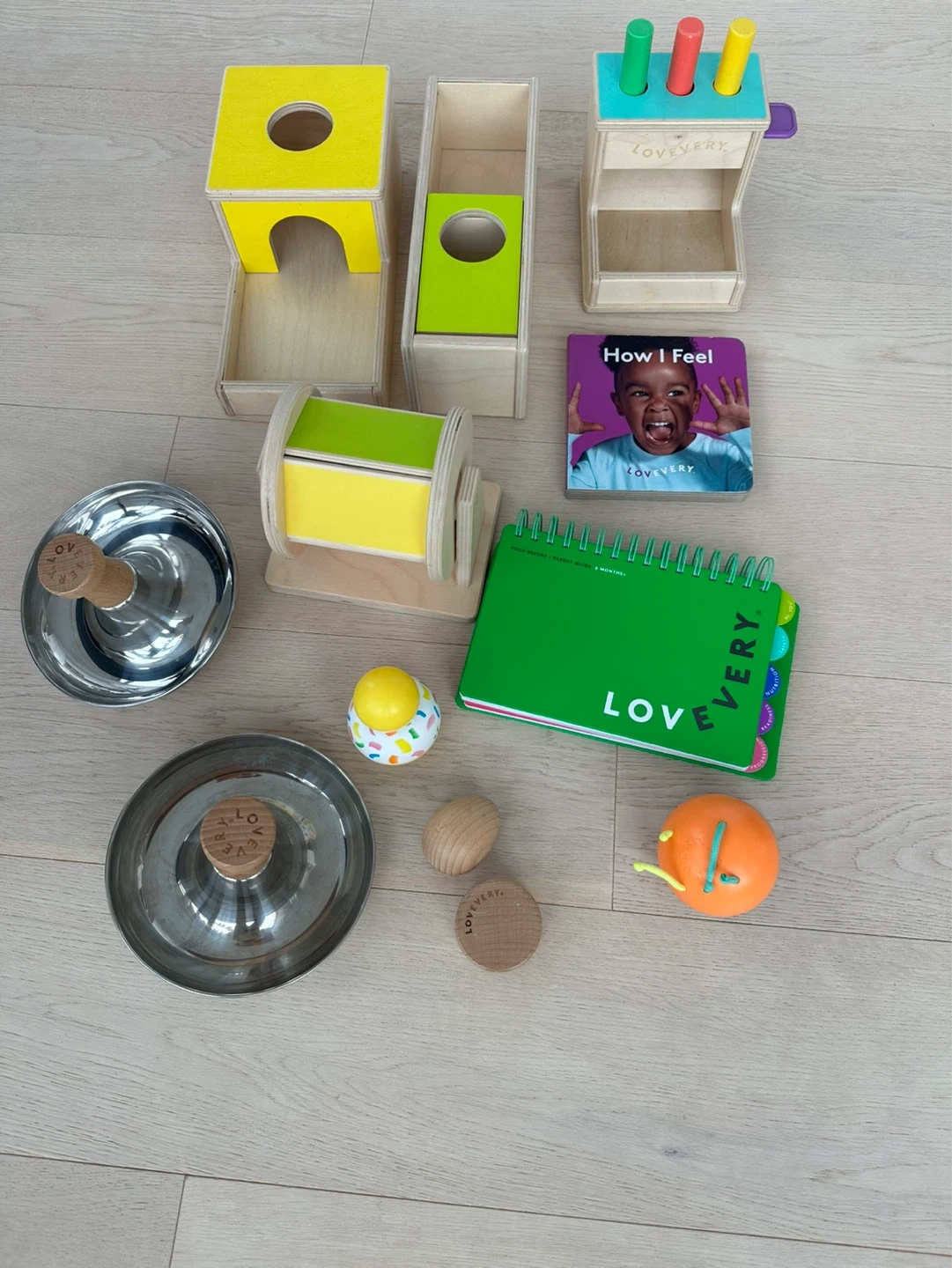 Includes several wooden and metal toys for infant development. Items feature bright colours and tactile elements. Suitable for young children.