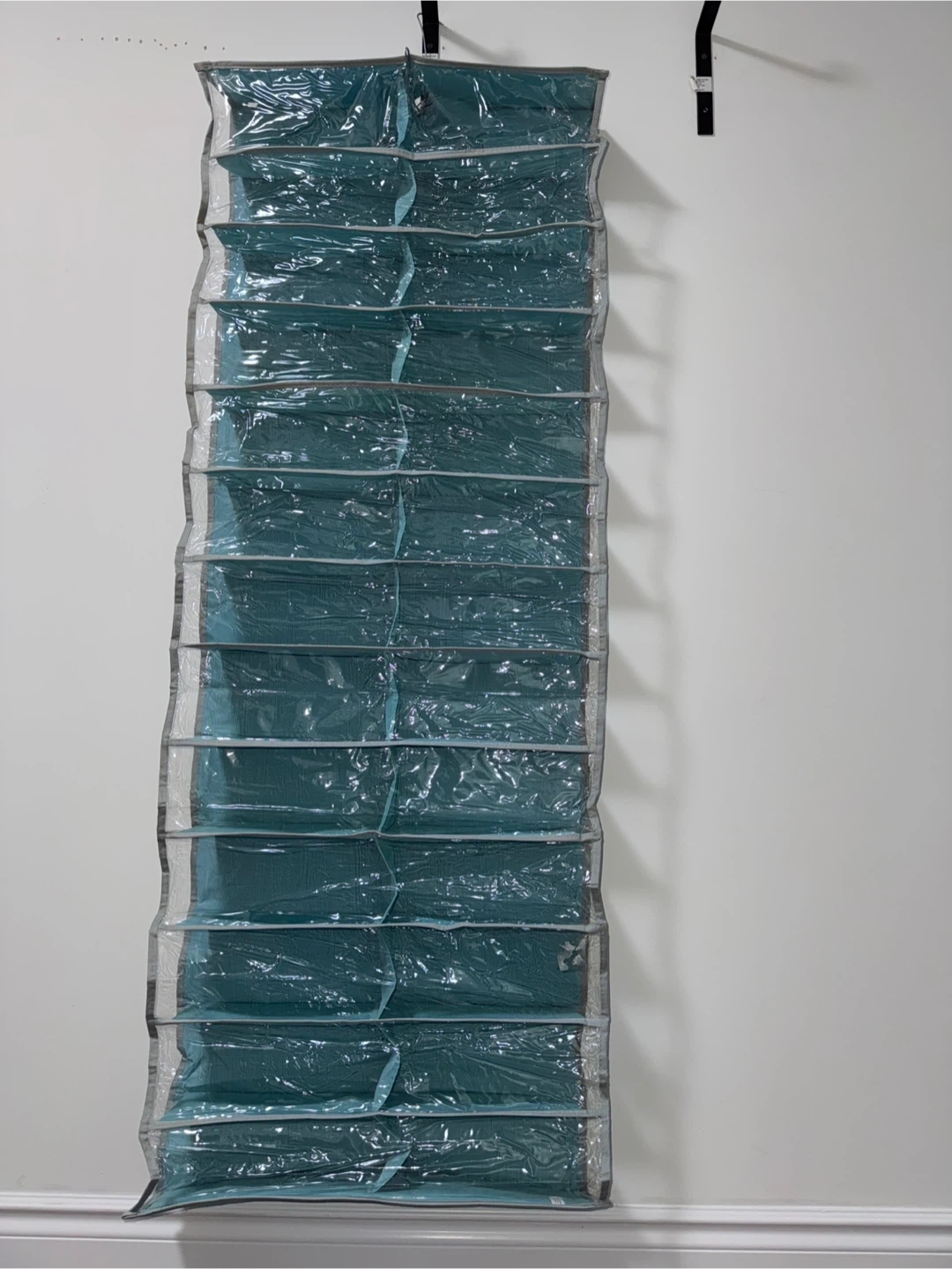 This is a hanging closet organizer with multiple shelves. It's made of fabric and has clear plastic covers for each shelf. Great for organizing shoes, accessories, or small clothing items!
