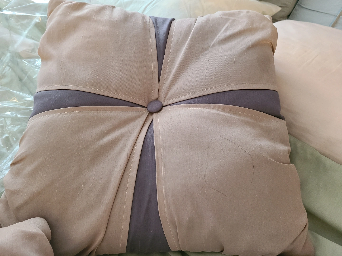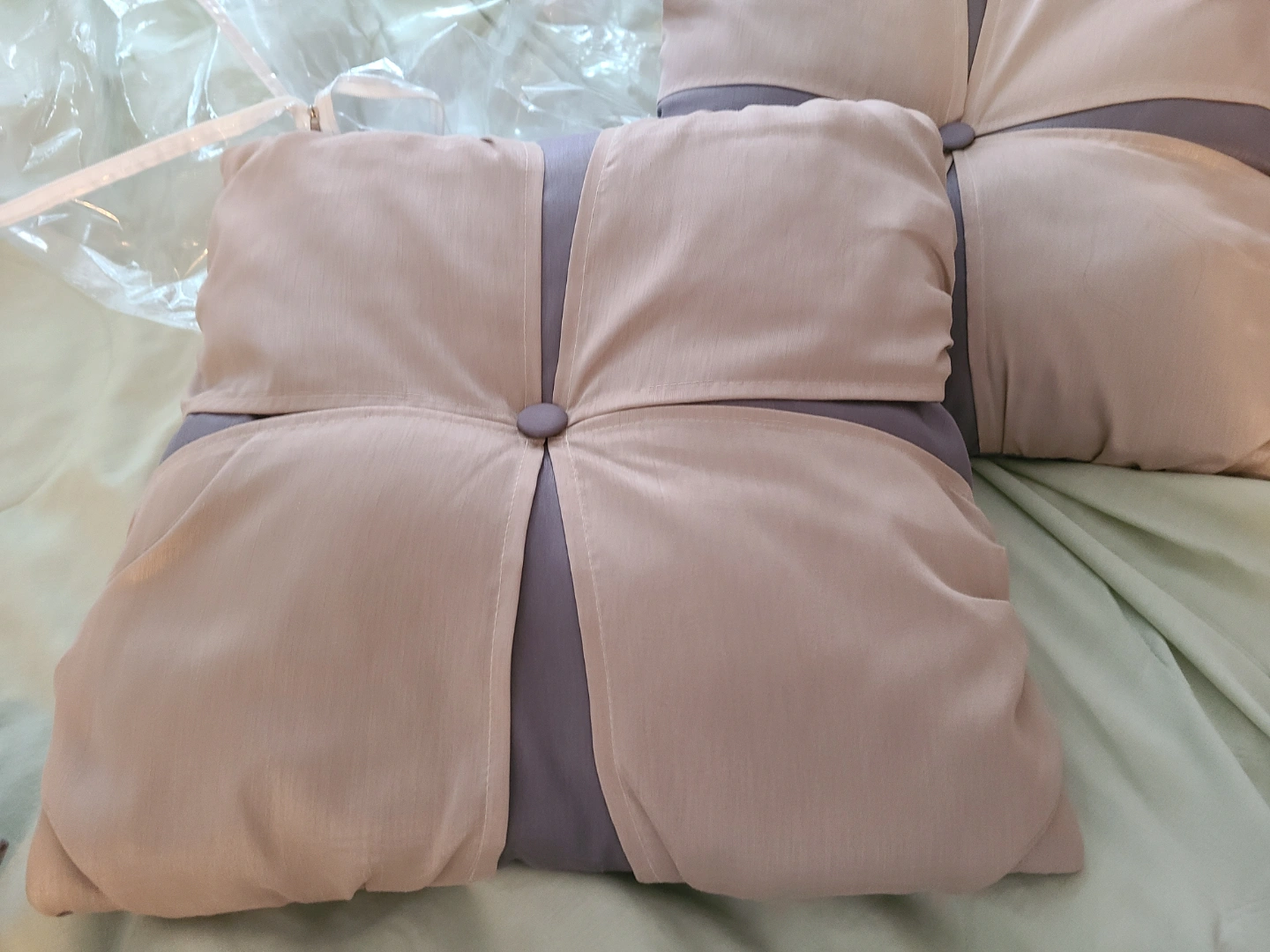 Two gold and grey decorative throw pillows. Square shape, button accents. Subtle sheen to the fabric. Great for adding a touch of elegance to your living room or bedroom.