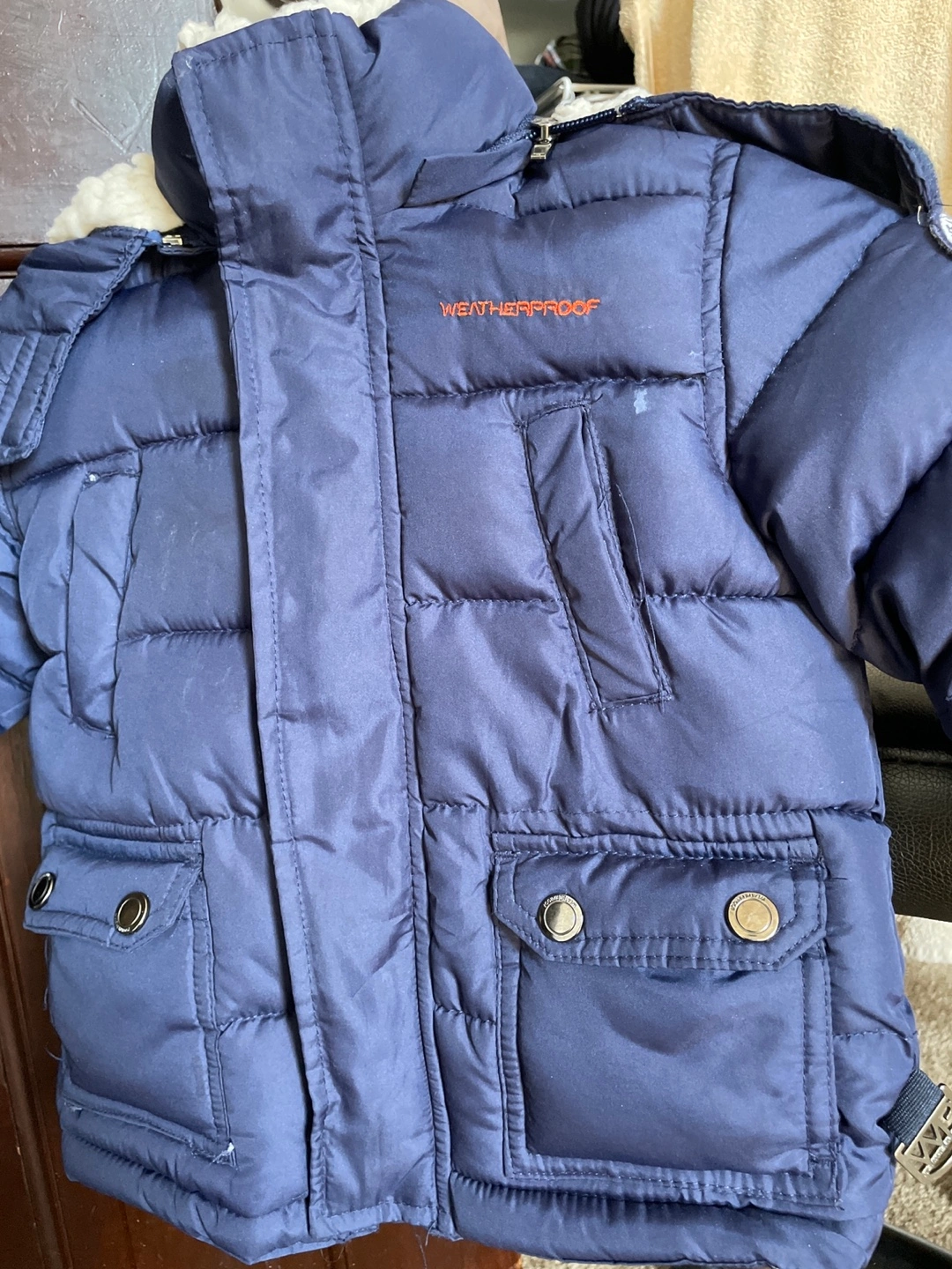 # free cycle Navy blue puffer jacket. Features a hood and zipper closure. Has two lower pockets. Suitable for cold weather.