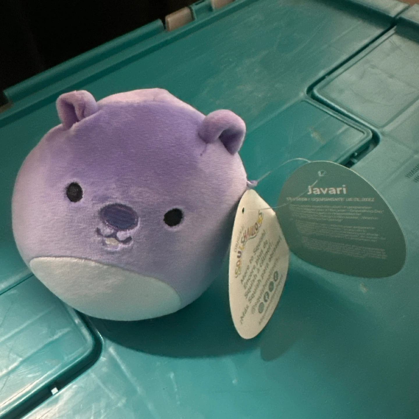 This is a Squishmallows plush toy named Javari. It's lavender colored with a soft, cuddly texture. It's made of polyester fiber.