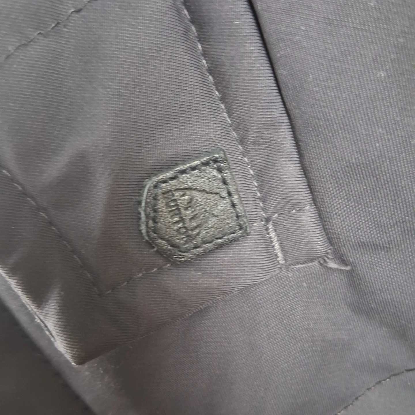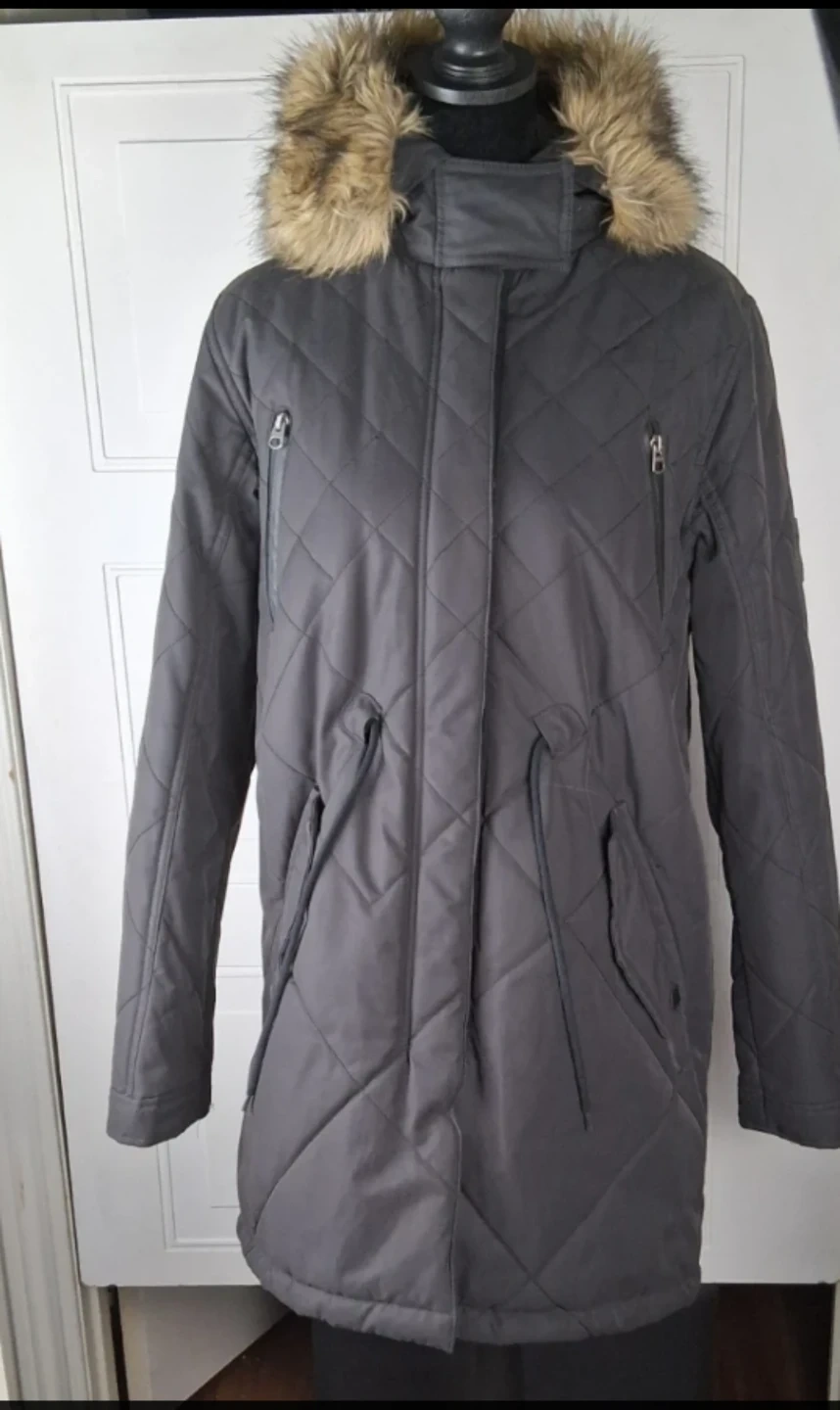 This stylish grey quilted parka jacket features a cozy faux fur-lined hood. It has a drawstring waist for a customizable fit. Two zippered chest pockets and two flap pockets add practicality.