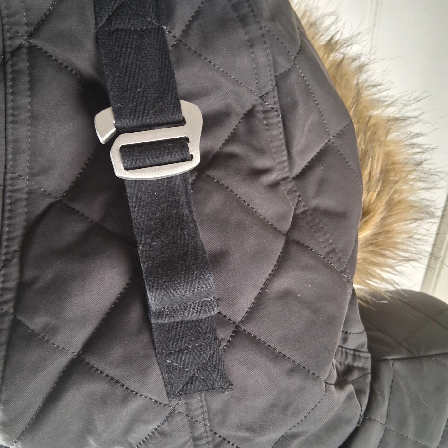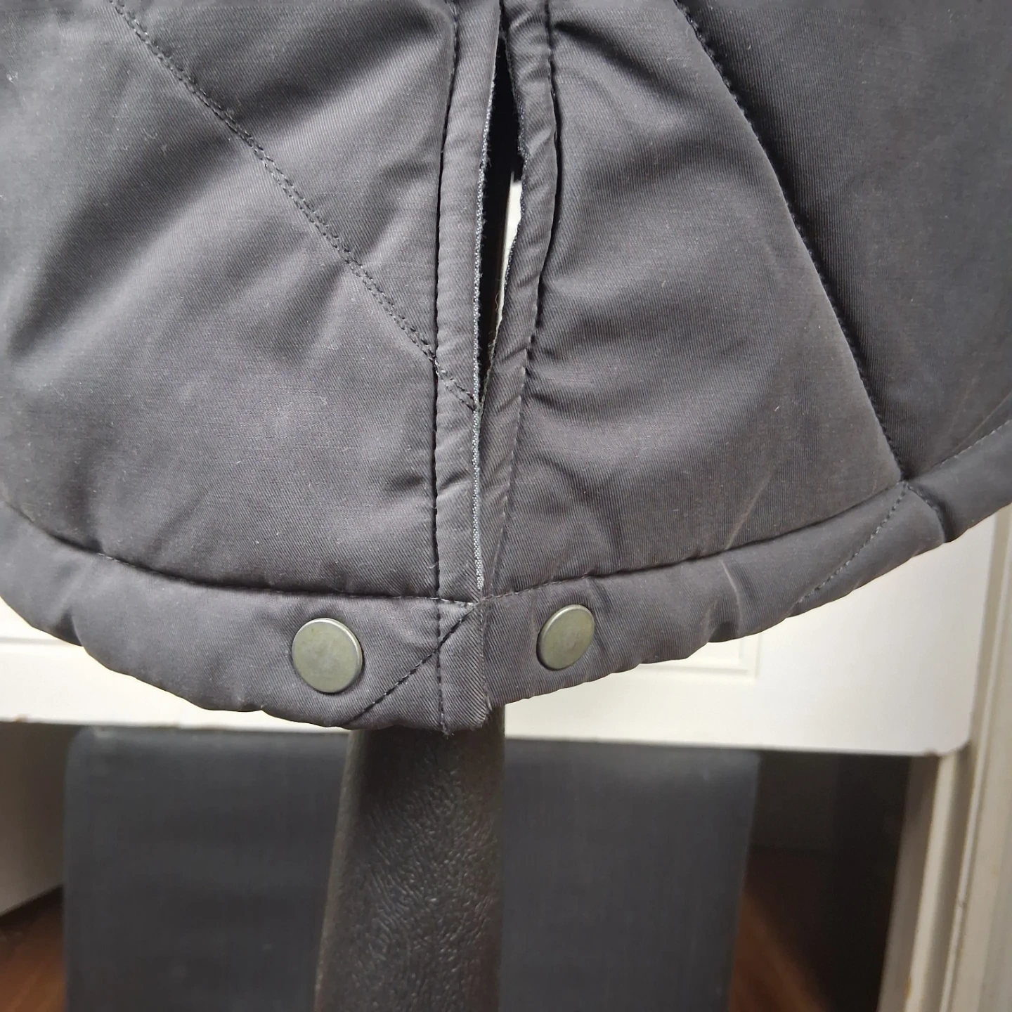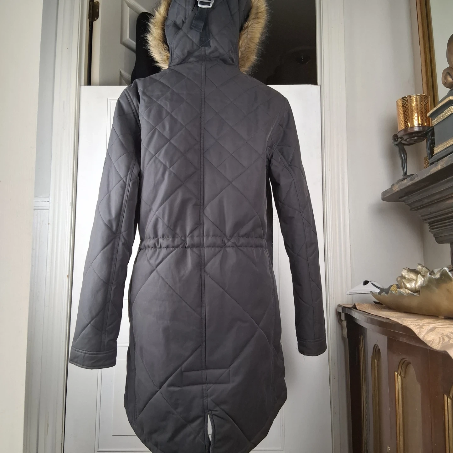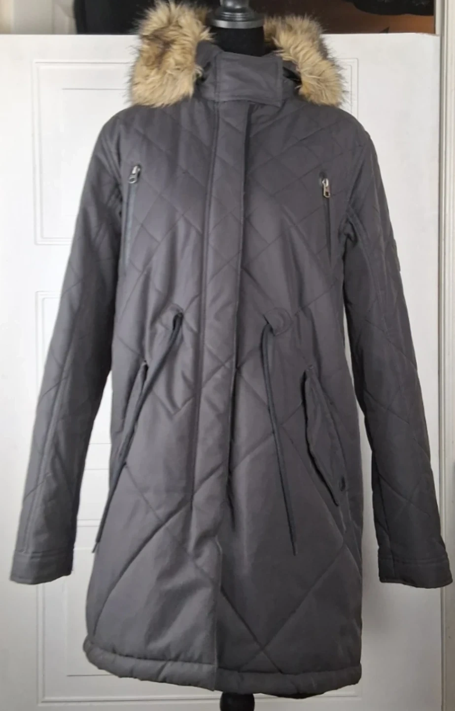 This stylish grey quilted parka jacket features a cozy faux fur-lined hood. It has a drawstring waist for a customizable fit. Two zippered chest pockets and two flap pockets add practicality.
