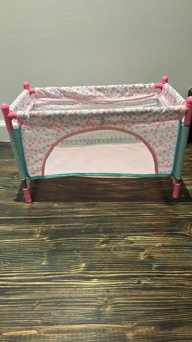 A cute doll crib or bassinet with a pink and floral fabric. It features a mesh window on the side and stands on pink legs. Perfect for imaginative play with dolls!