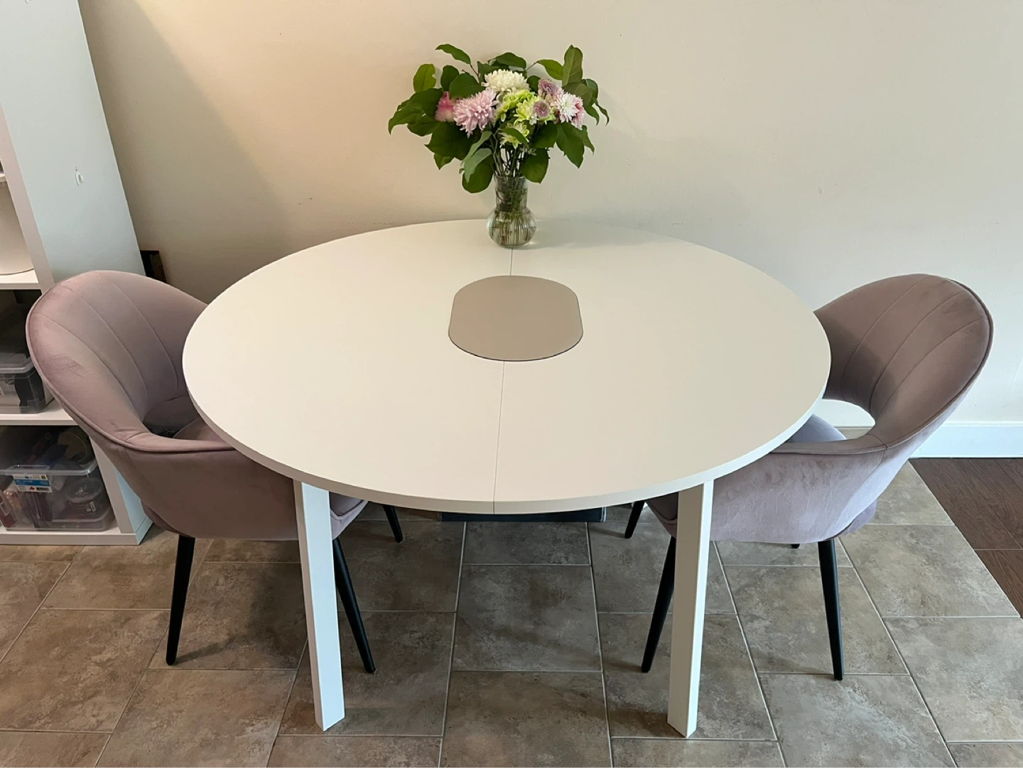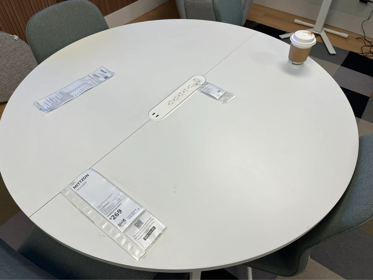 This is an IKEA MITTZON round table with a power outlet in the middle usually sold separately. We bought it last year to use as a dining table and it has been well cared for. No damage or marks.
