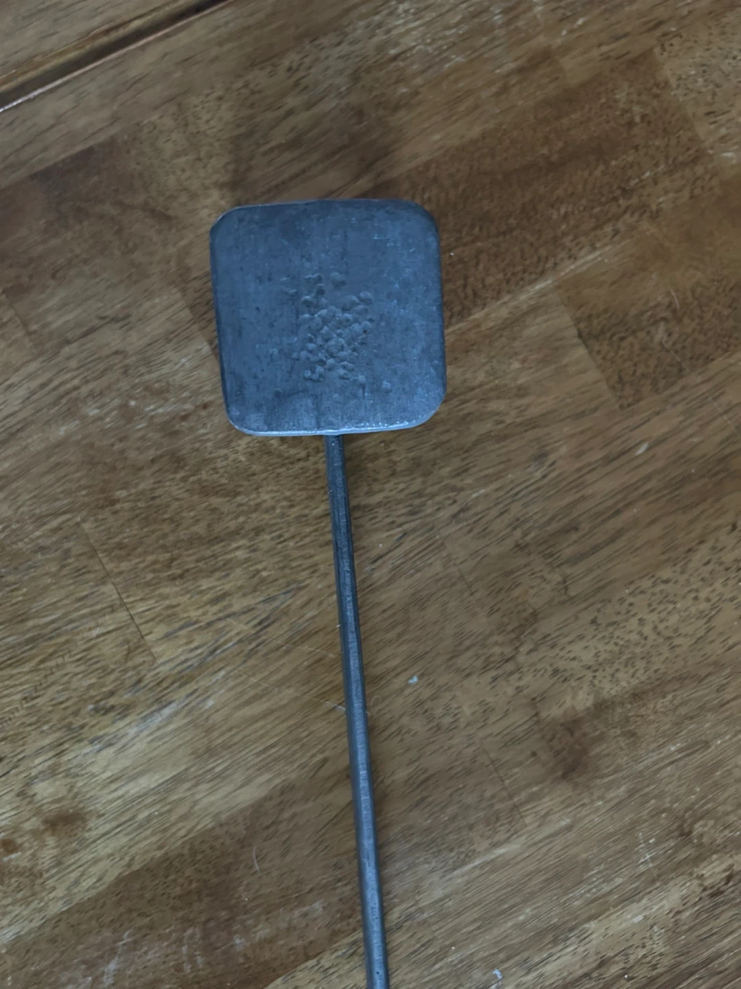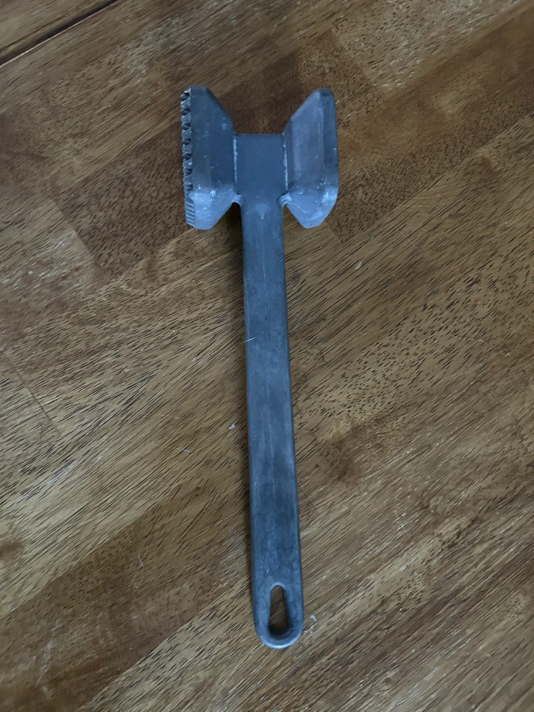 Selling a used meat tenderizer tool. It has a square head with a textured surface on one side and a flat surface on the other. The handle is made of metal