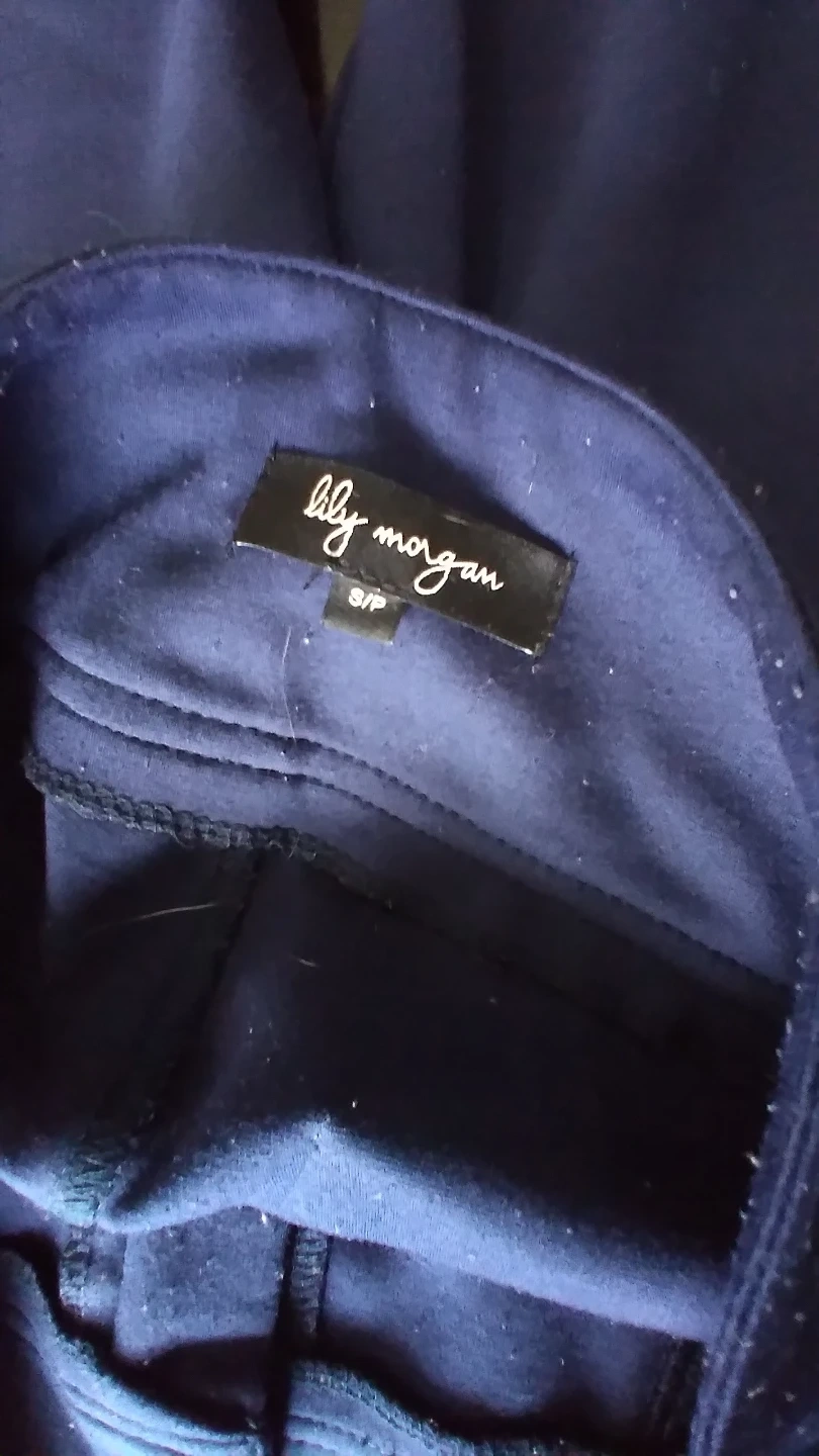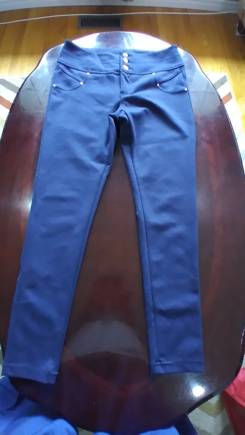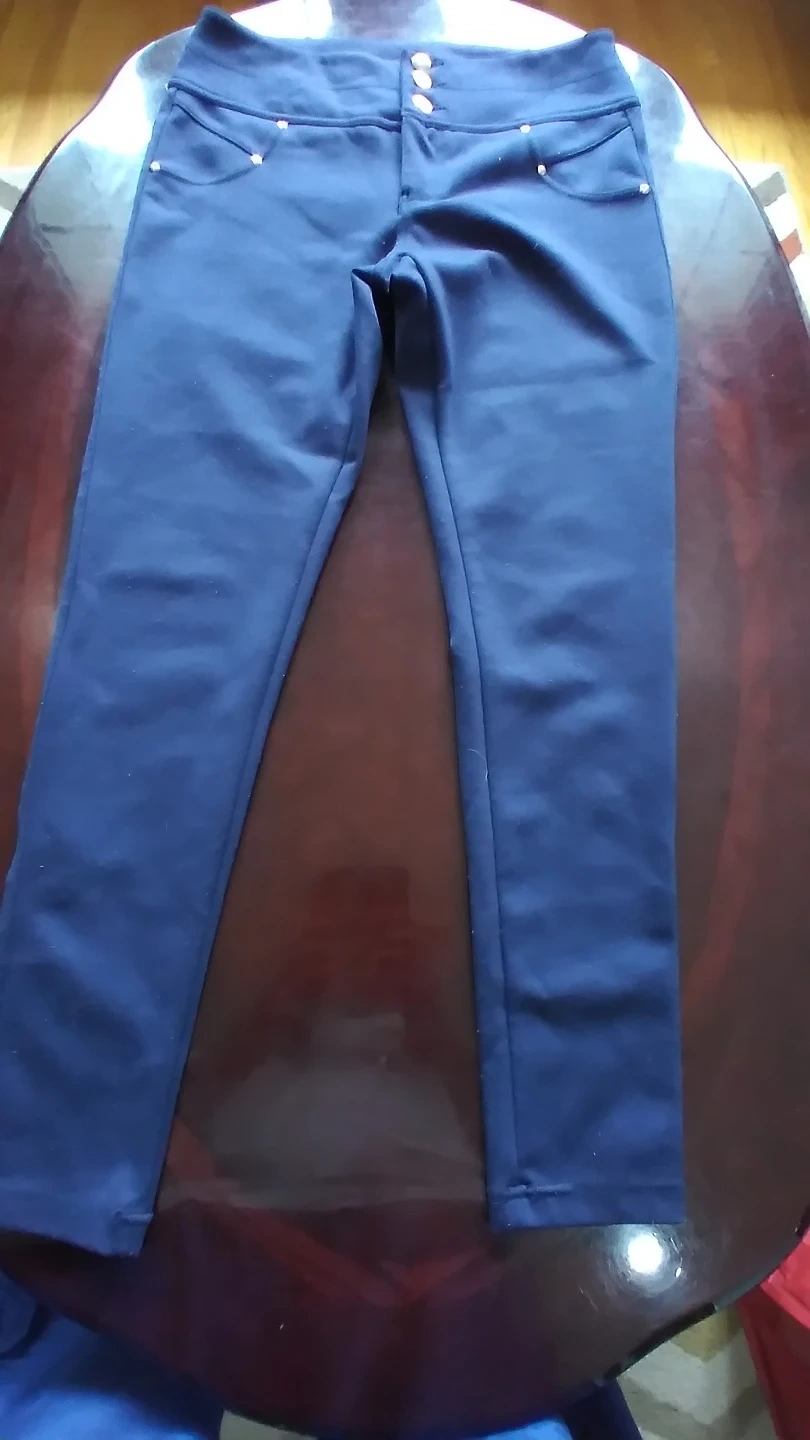 These navy blue pants feature a high-waisted design with a four-button fly. They have a slim fit and come in a stretchy material. Pockets on the front and back.