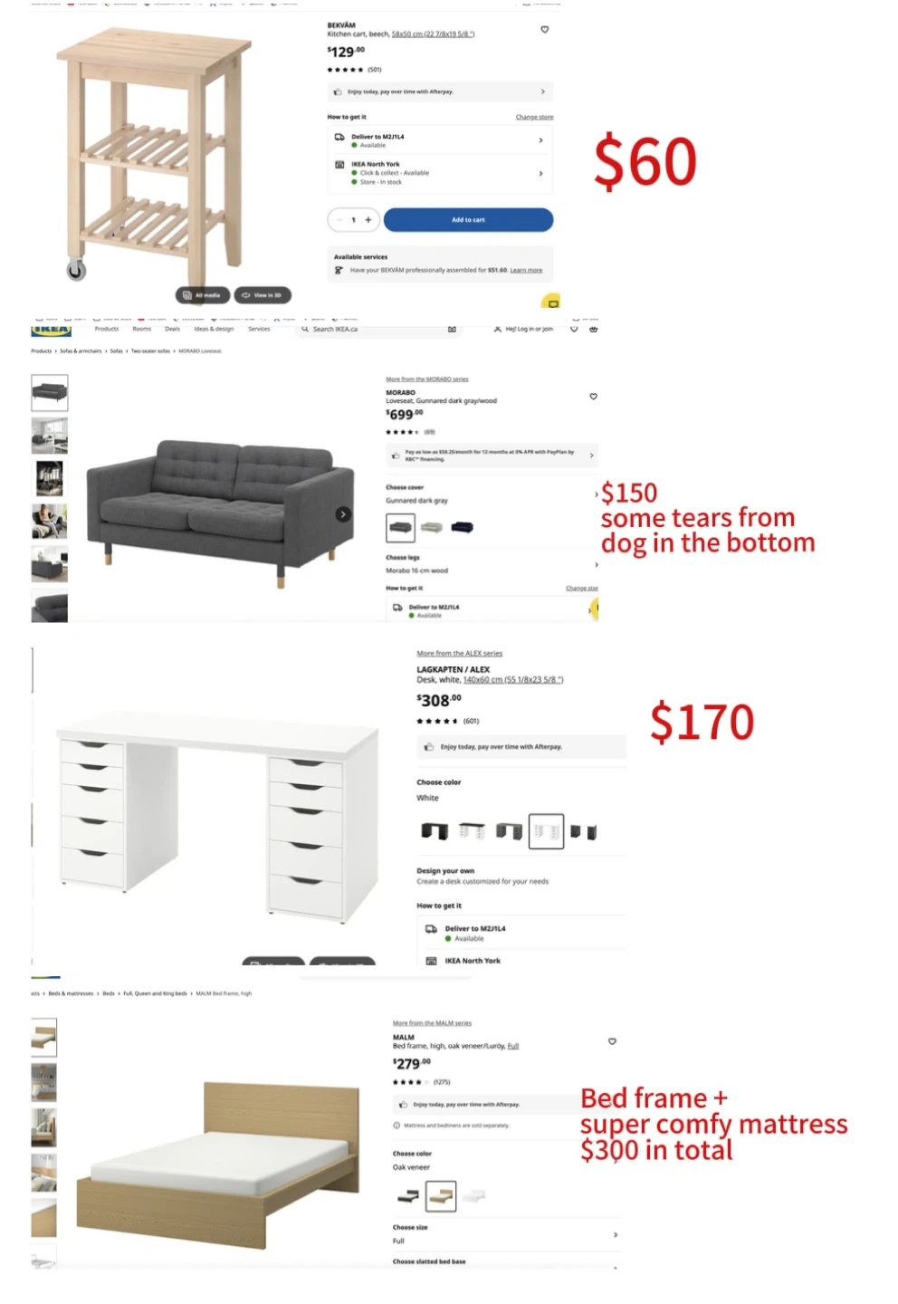 * Bed frame + super comfy mattress: $300