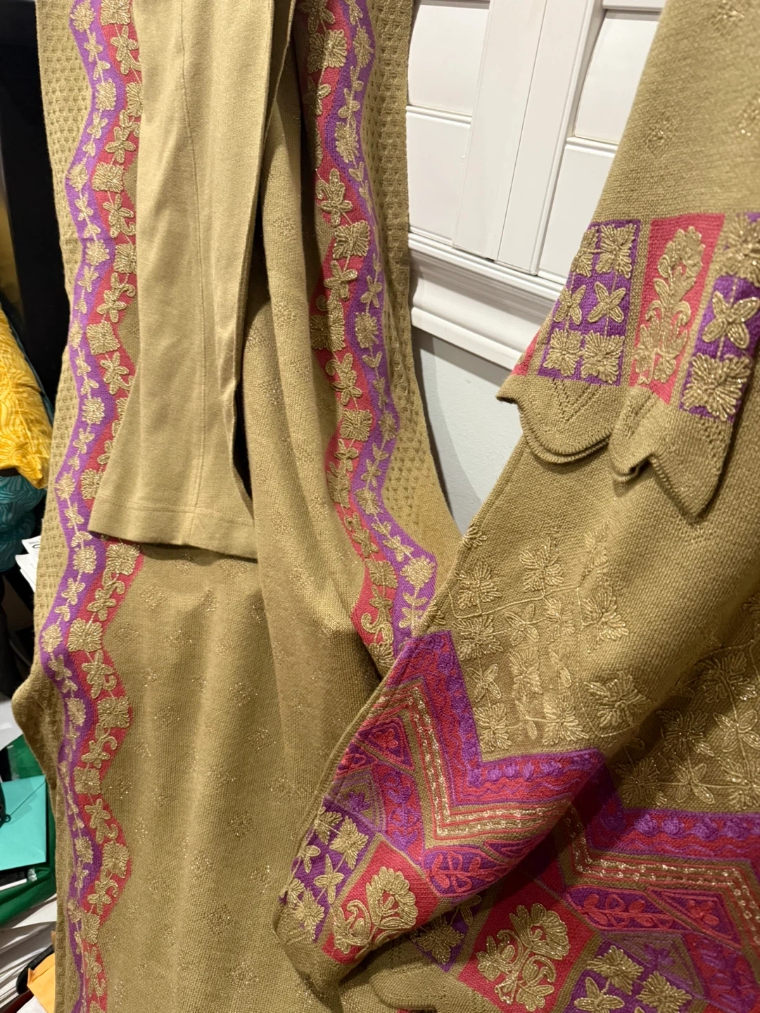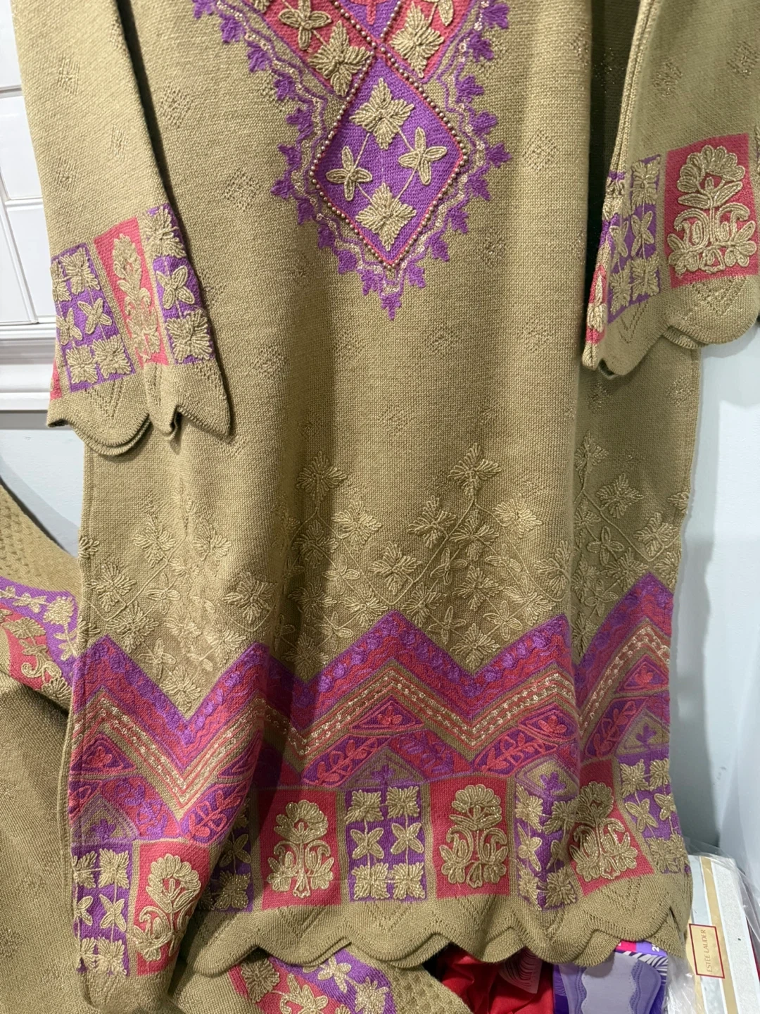 Selling a beautiful ladies' three-piece shalwar kameez suit. It's a size large and features lovely embroidery detailing in purple, pink, and gold on a tan background. Perfect for a special occasion or just feeling a bit fancy!
