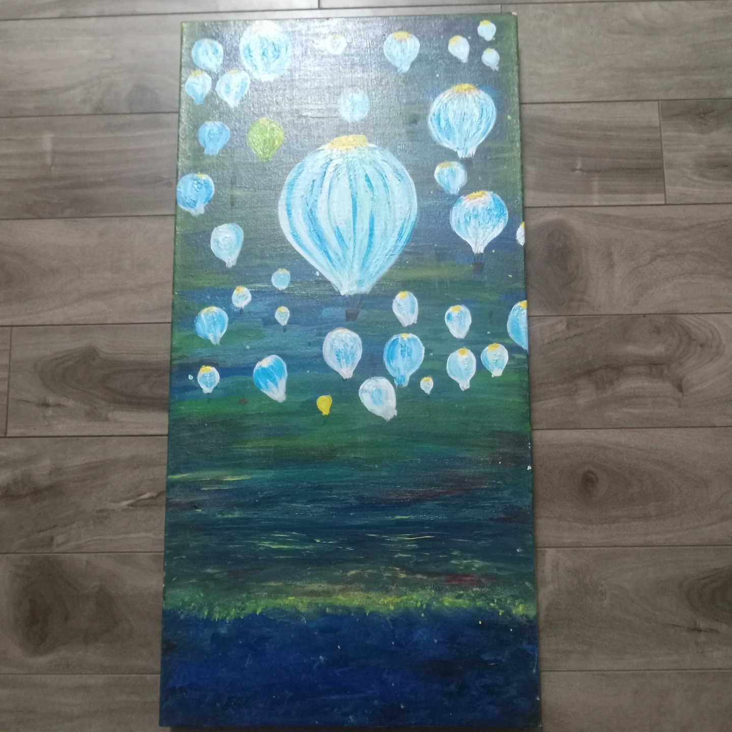 This is a painting of various hot air balloons floating in a dark, textured sky. The balloons are rendered in shades of blue, white, and yellow, with some appearing more detailed than others. The background depicts a landscape of dark greens and blues with hints of yellow and red.