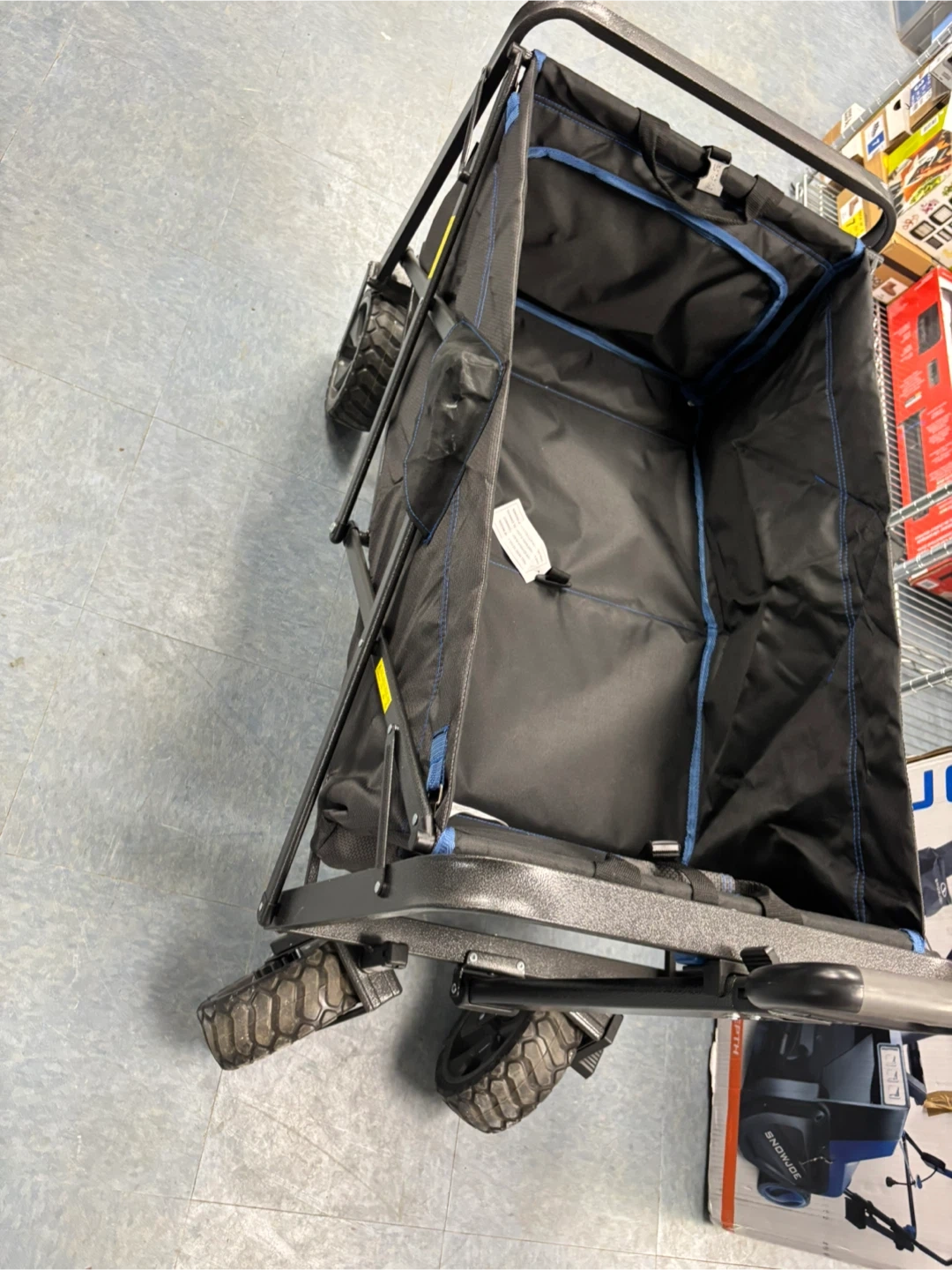This black folding wagon is perfect for hauling gear. It features a sturdy metal frame and durable fabric. It's collapsible for easy storage and transport!