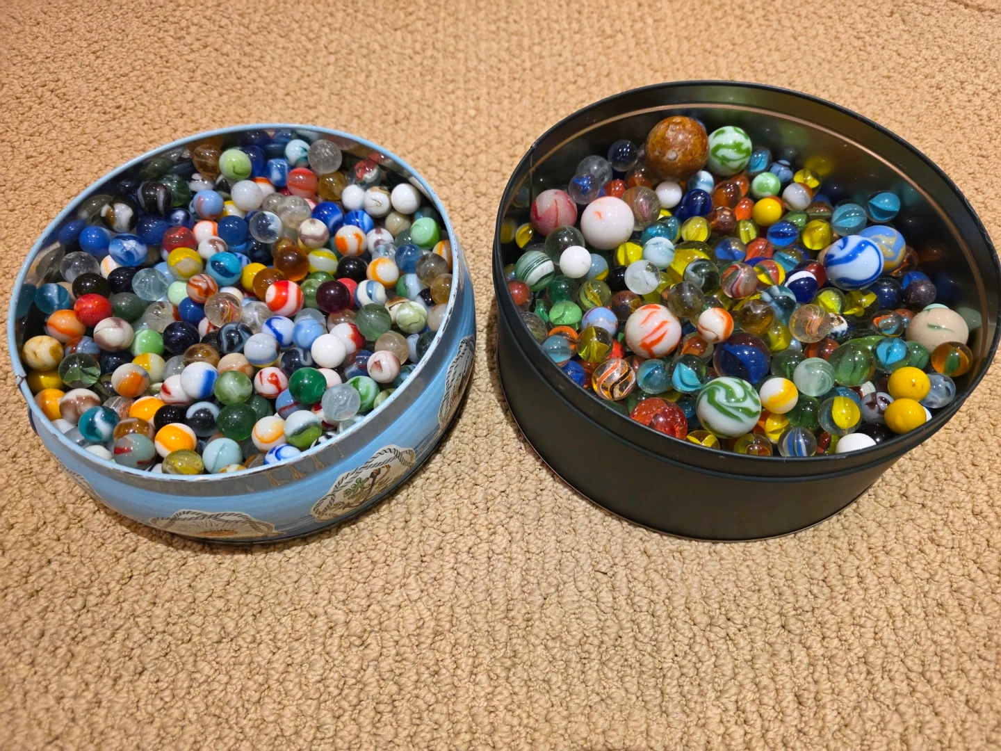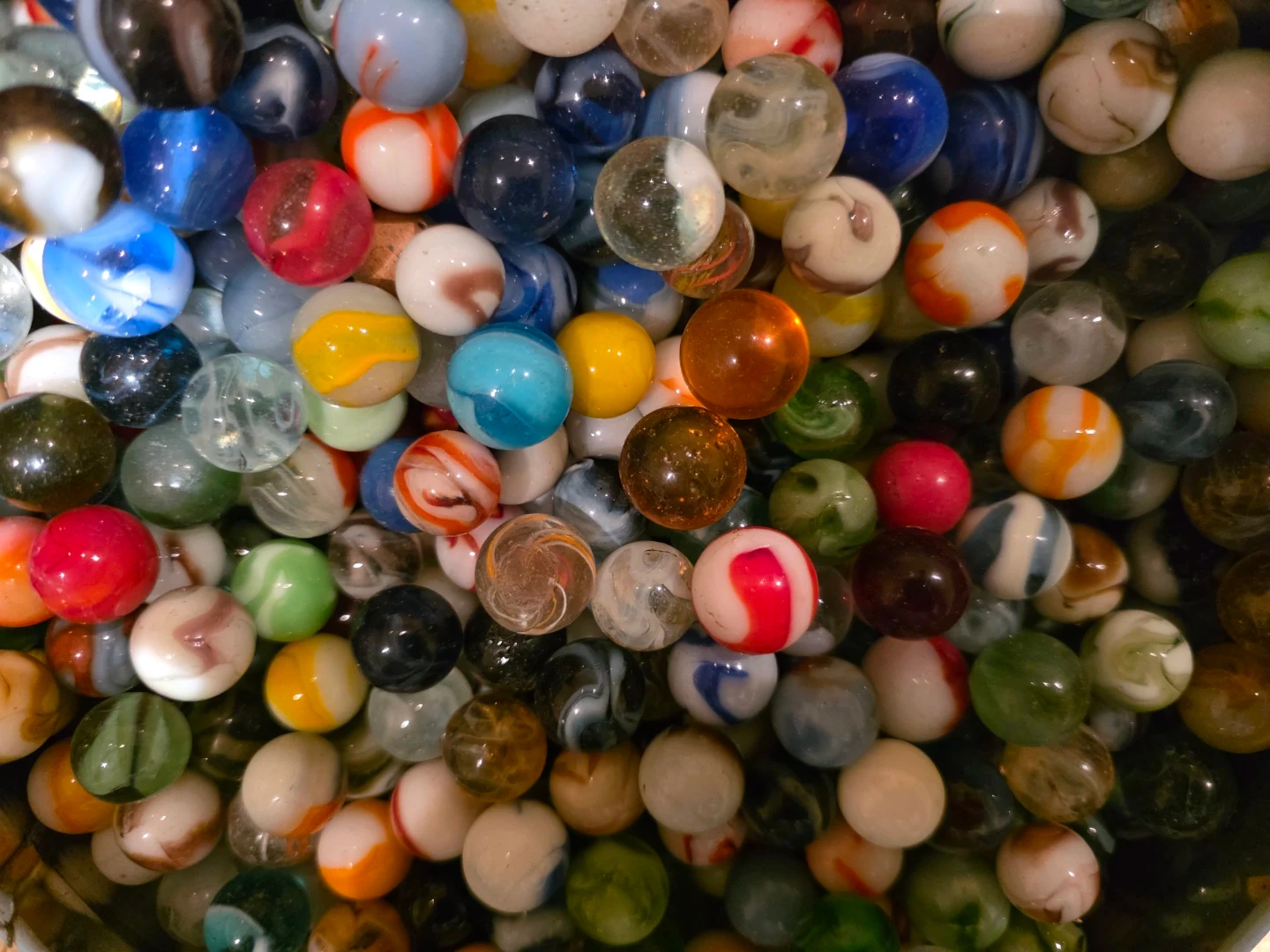 A large collection of colourful glass marbles in various sizes and patterns. These marbles are suitable for games or as decorative items. They come in assorted colours including blue, red, green, yellow, and orange.