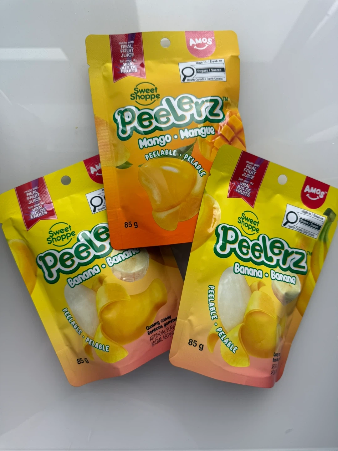 Three bags of Sweet Shoppe Peelerz gummy candy. Includes one mango flavour and two banana flavours. Each bag contains 85g. Made with real fruit juice. Peelable gummy candy.