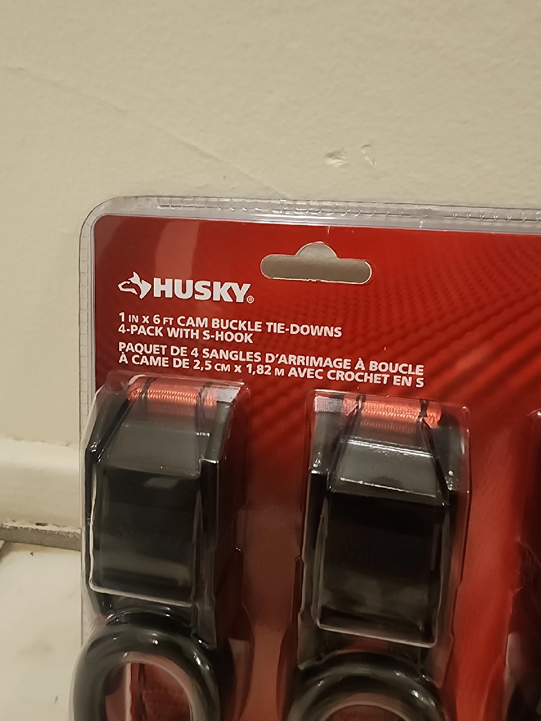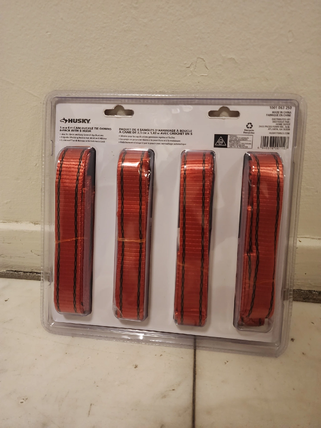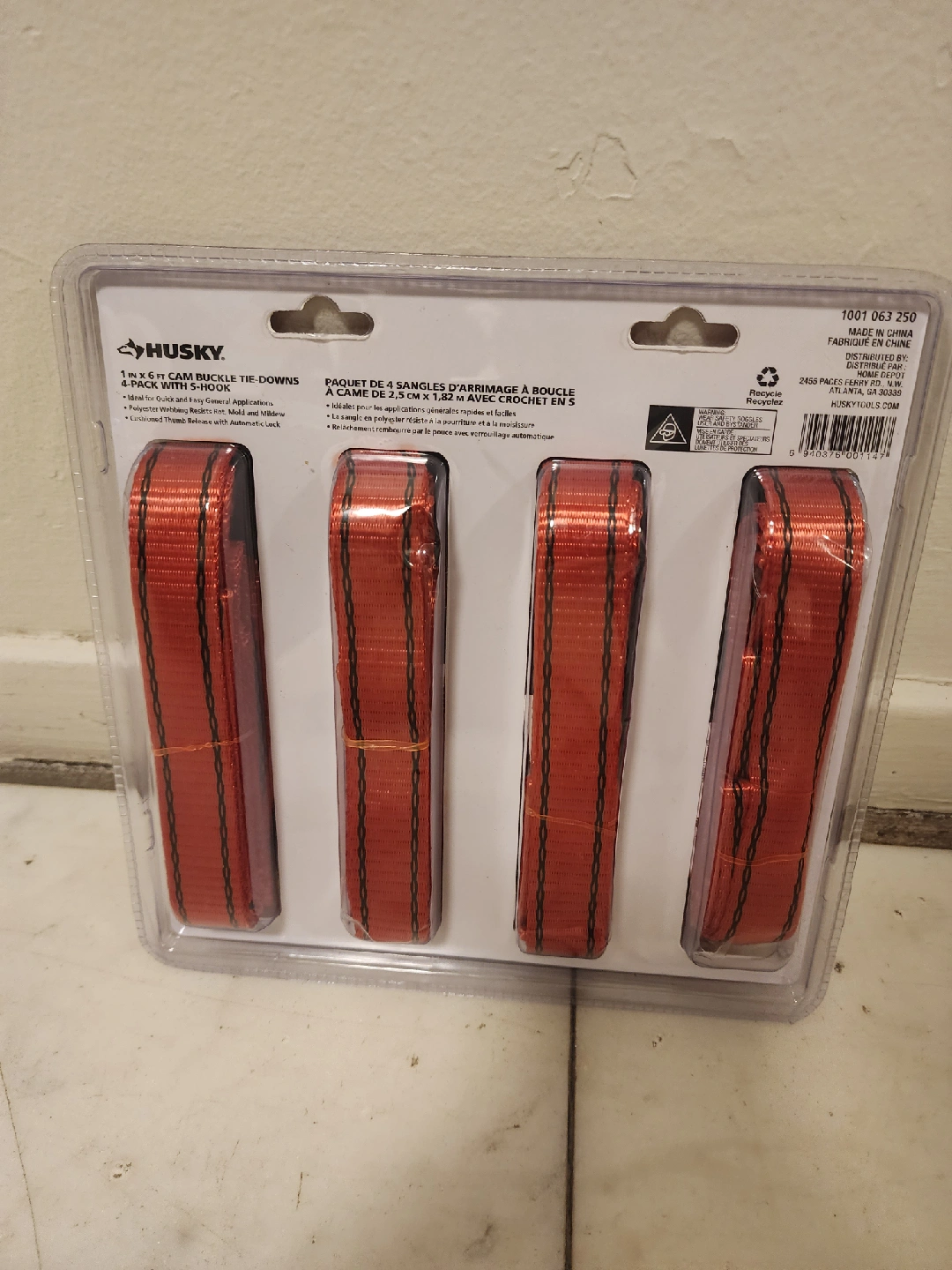 Selling a brand new, unopened 4-pack of Husky cam buckle tie-downs. These are 1 inch by 6 feet and come with S-hooks. Perfect for securing items for transport or storage!