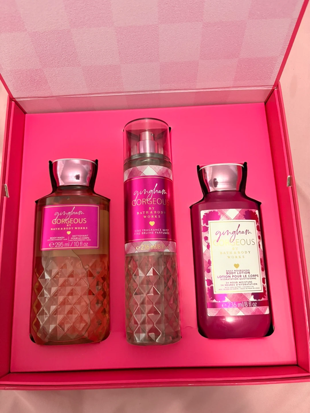 This Bath & Body Works Gingham Gorgeous gift set includes a body wash, body lotion, and fine fragrance mist. The body wash is 295 ml/10 fl oz, and the body lotion and fine fragrance mist are each 236 ml/8 fl oz. It's a lovely scent for everyday use!