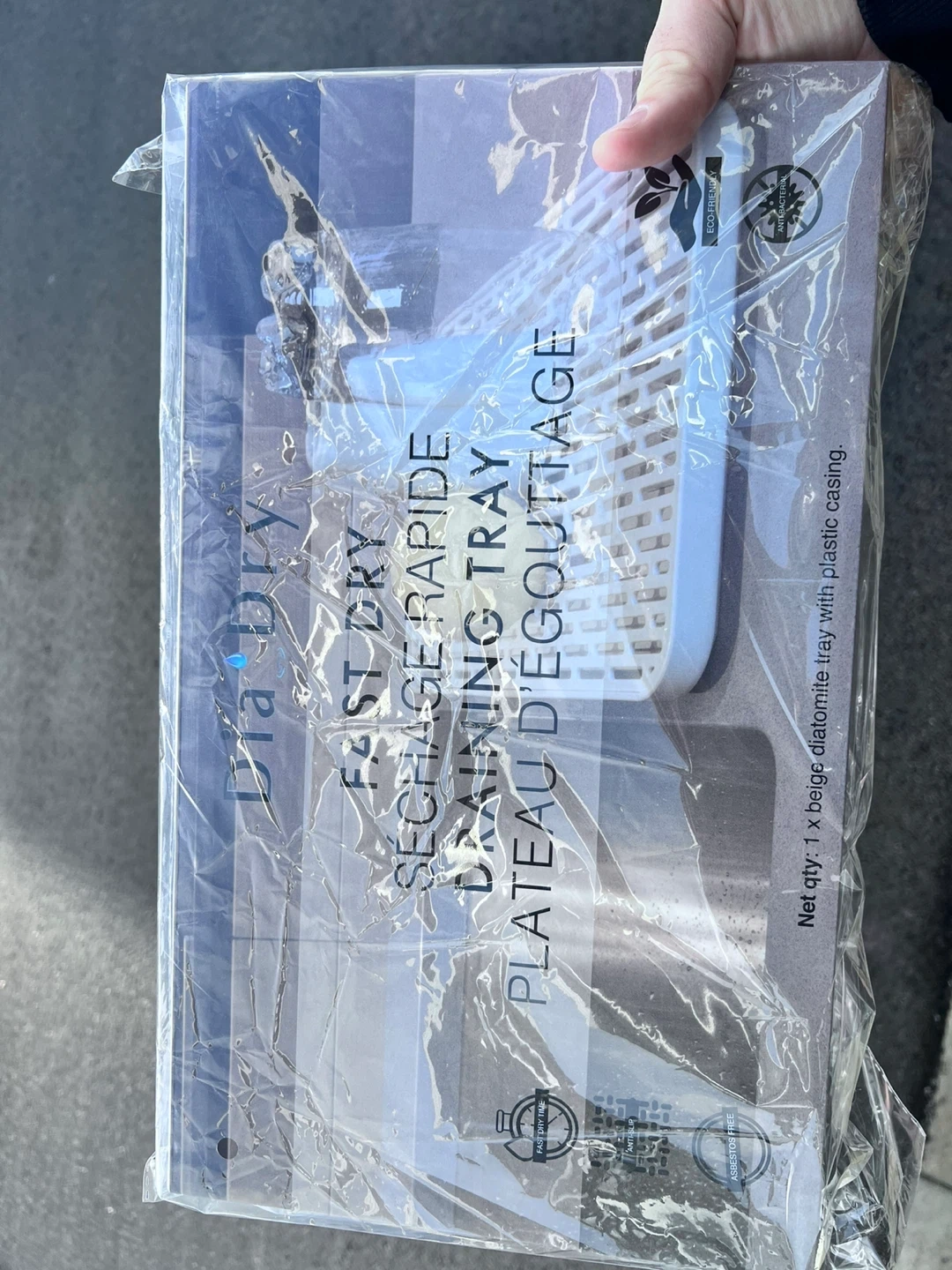 I'm selling a Dia Dry Fast Dry Draining Tray! It's a beige diatomite tray with plastic casing. Diatomaceous earth is a soft, naturally occurring sedimentary rock crushed into a fine powder with an absorption rate of up to four times it's own weight. It is 60 times more absorbant than spong