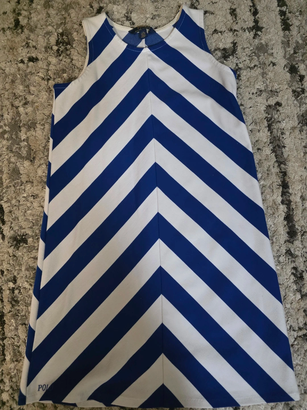 Selling a cute Polo Ralph Lauren dress for girls. It's a size L (12-14) and features a stylish blue and white striped pattern. Perfect for any occasion!