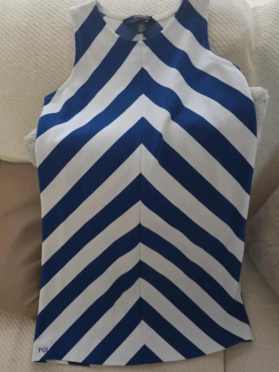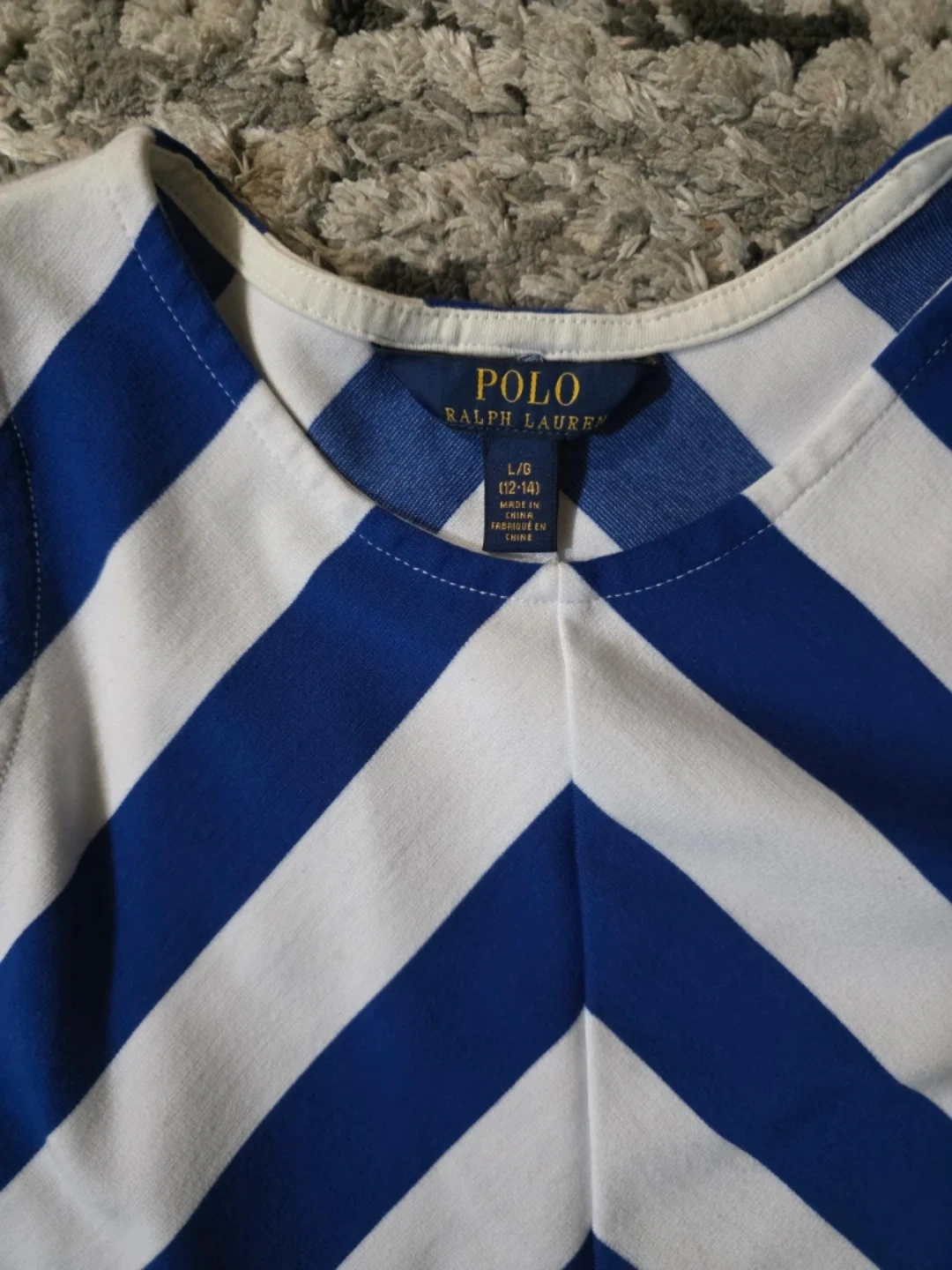 Selling a cute Polo Ralph Lauren dress for girls. It's a size L (12-14) and features a stylish blue and white striped pattern. Perfect for any occasion!