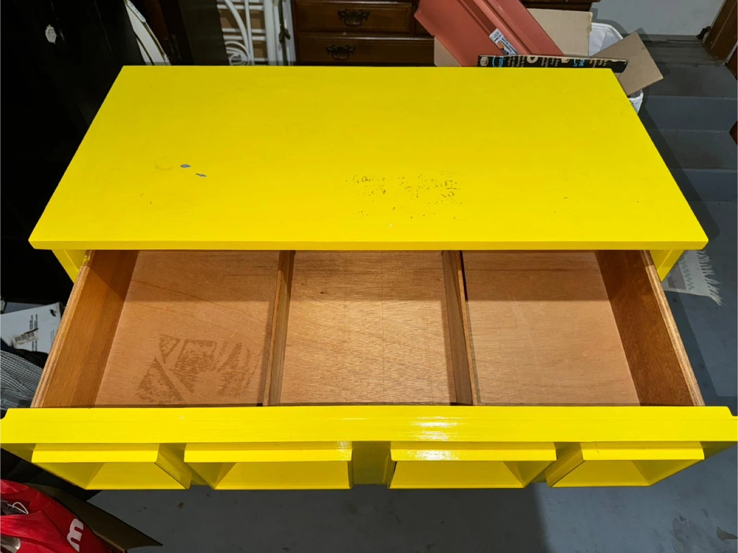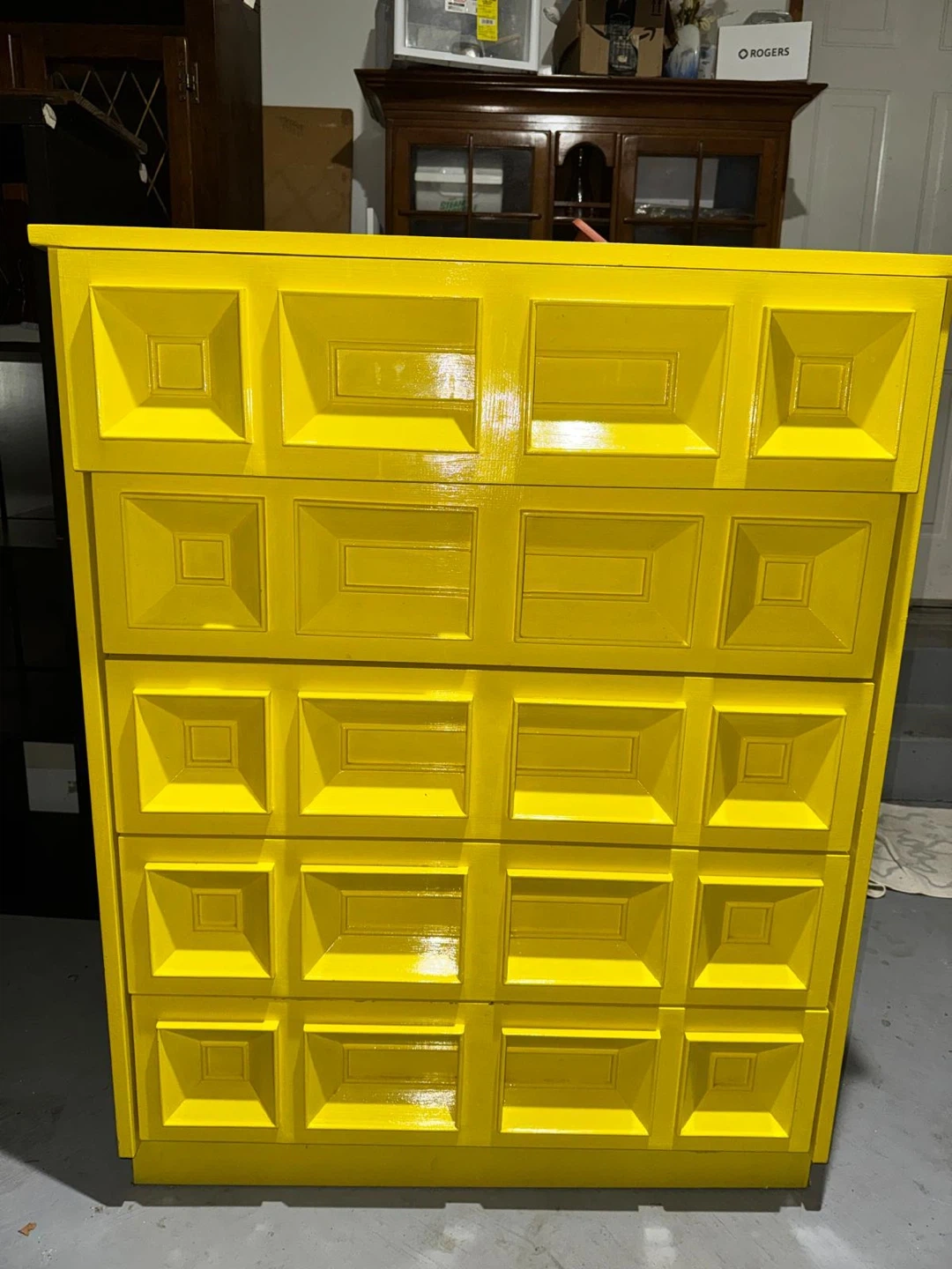This bright yellow dresser has a unique paneled front and features five drawers for ample storage. The interior of the drawers is made of wood. It's a statement piece for any room!