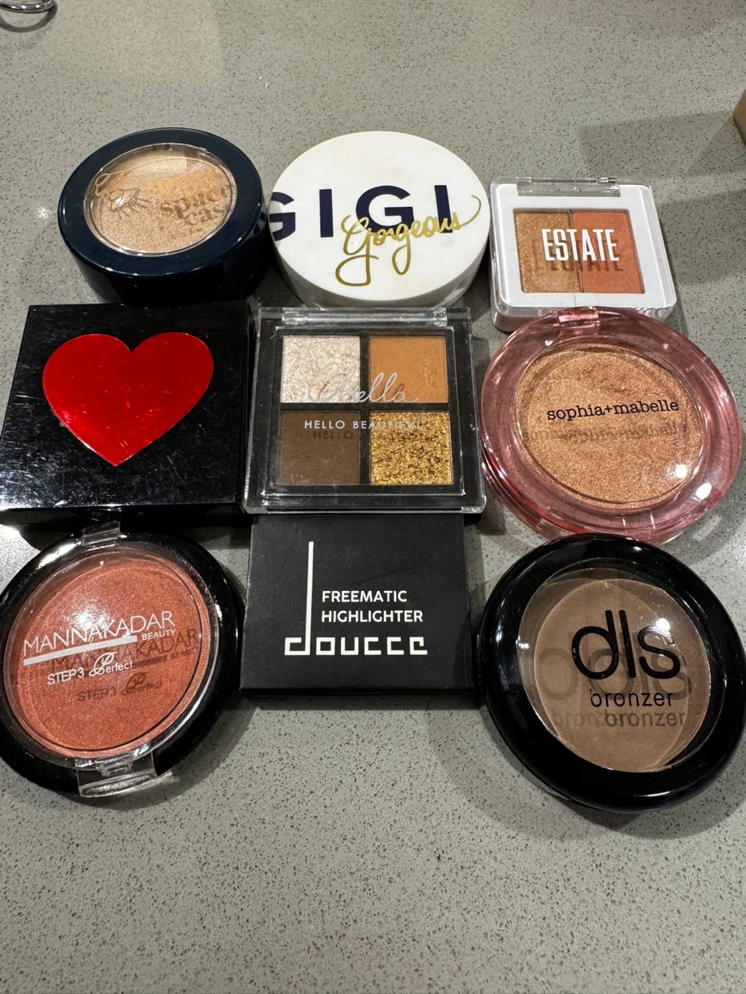 Bundle of makeup palettes, including blush, pressed powder, 2 eyeshadows, highlighter, and bronzer. All mini palettes are new and barely used.