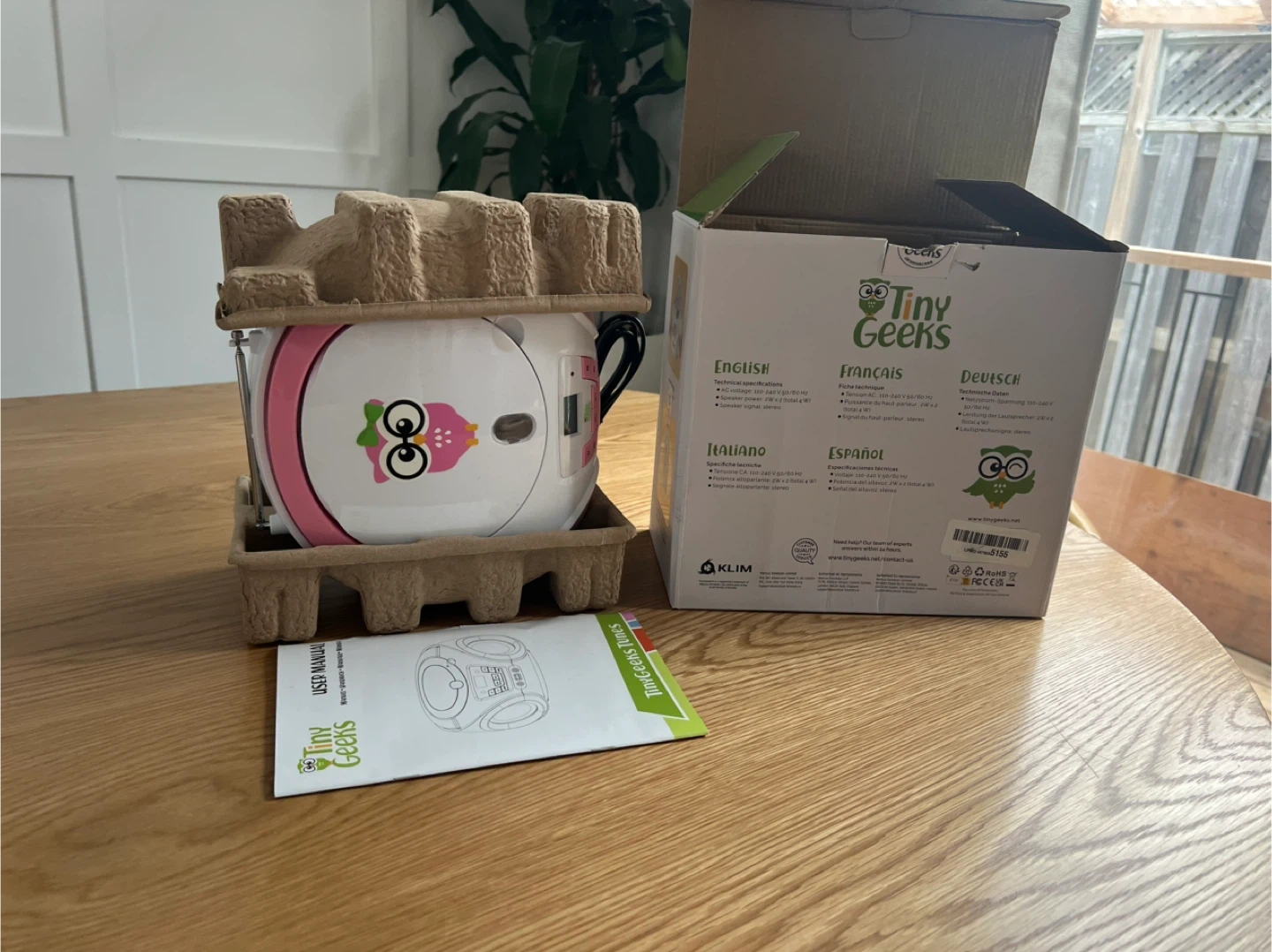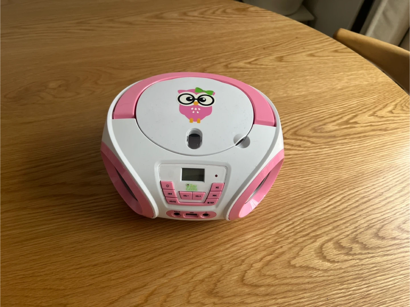This is a Tiny Geeks CD player boombox in pink and white. It comes with the original box and user manual. It features an AUX input and USB port for versatile playback options.