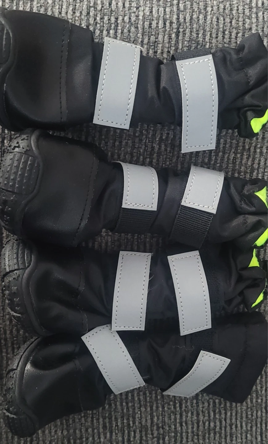 Set of four black boots for med-small dogs. They have adjustable reflective straps for a secure fit and a paw print logo on the sole. Size 55 mm (2.16") is printed on the bottom.